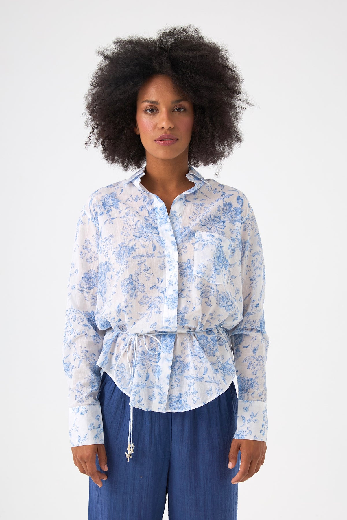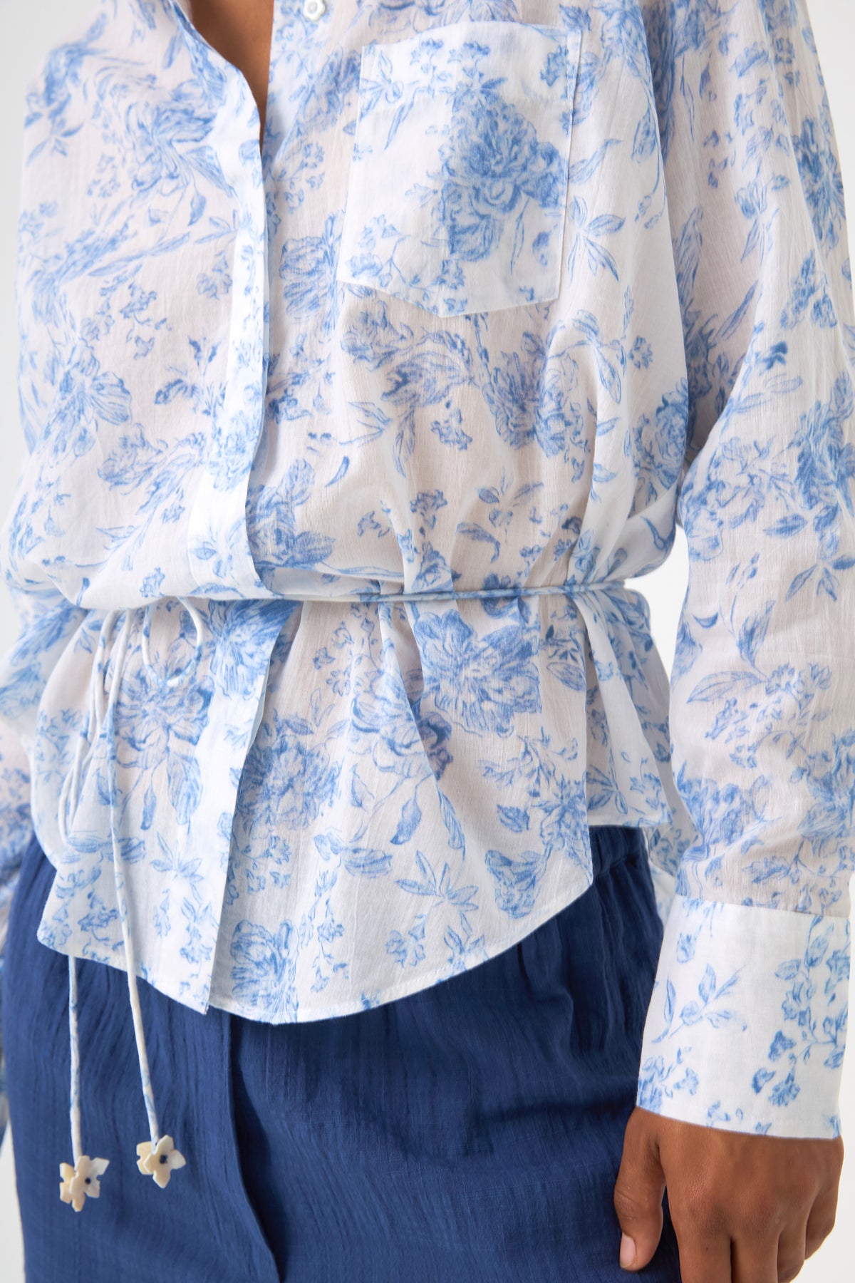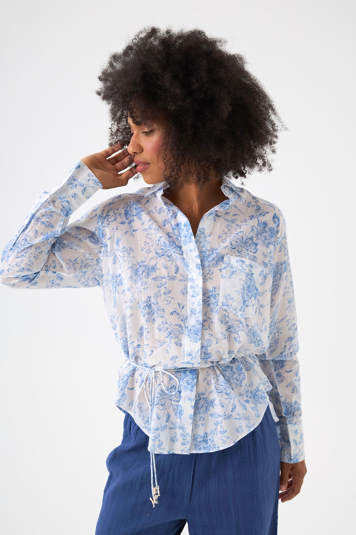 Cette chemise en coton au motif floral romantique revisite l'élégance décontractée avec une précision remarquable. Sa coupe droite et son col classique sont sublimés par une ceinture ficelle en tissu aux finitions bijoux délicates, offrant un contraste raffiné entre la douceur de son imprimé printanier et l'éclat des détails précieux.