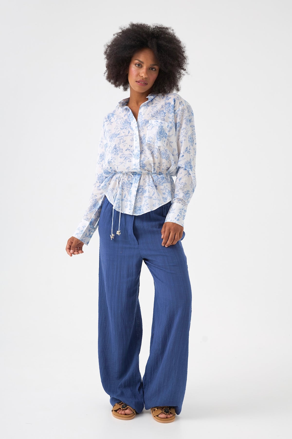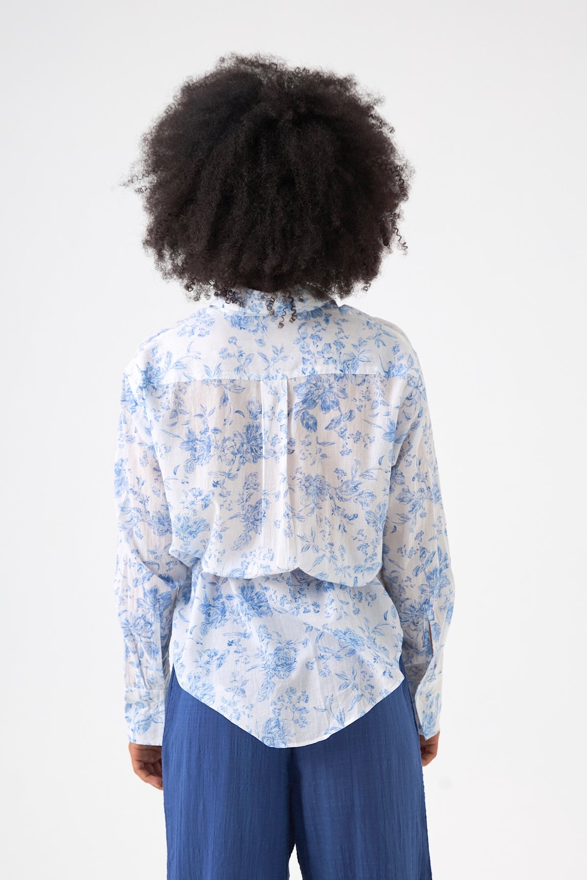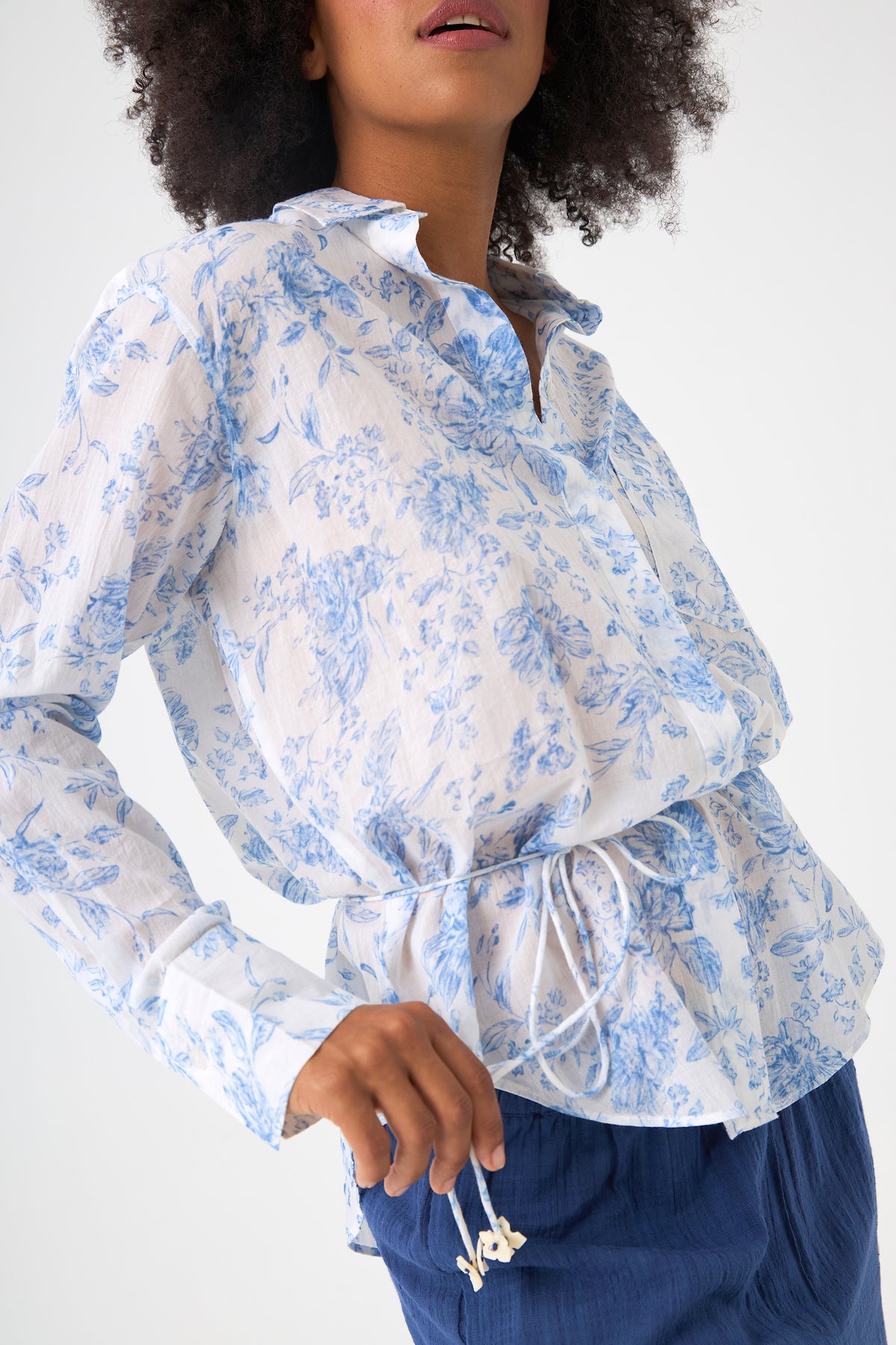 Cette chemise en coton au motif floral romantique revisite l'élégance décontractée avec une précision remarquable. Sa coupe droite et son col classique sont sublimés par une ceinture ficelle en tissu aux finitions bijoux délicates, offrant un contraste raffiné entre la douceur de son imprimé printanier et l'éclat des détails précieux.