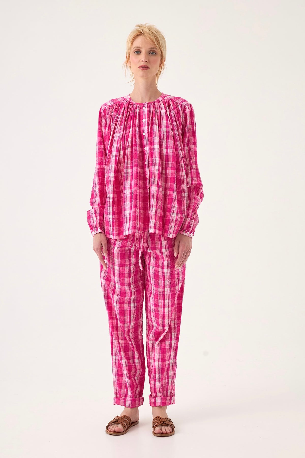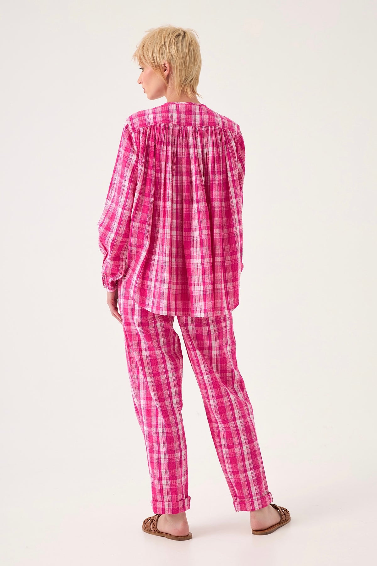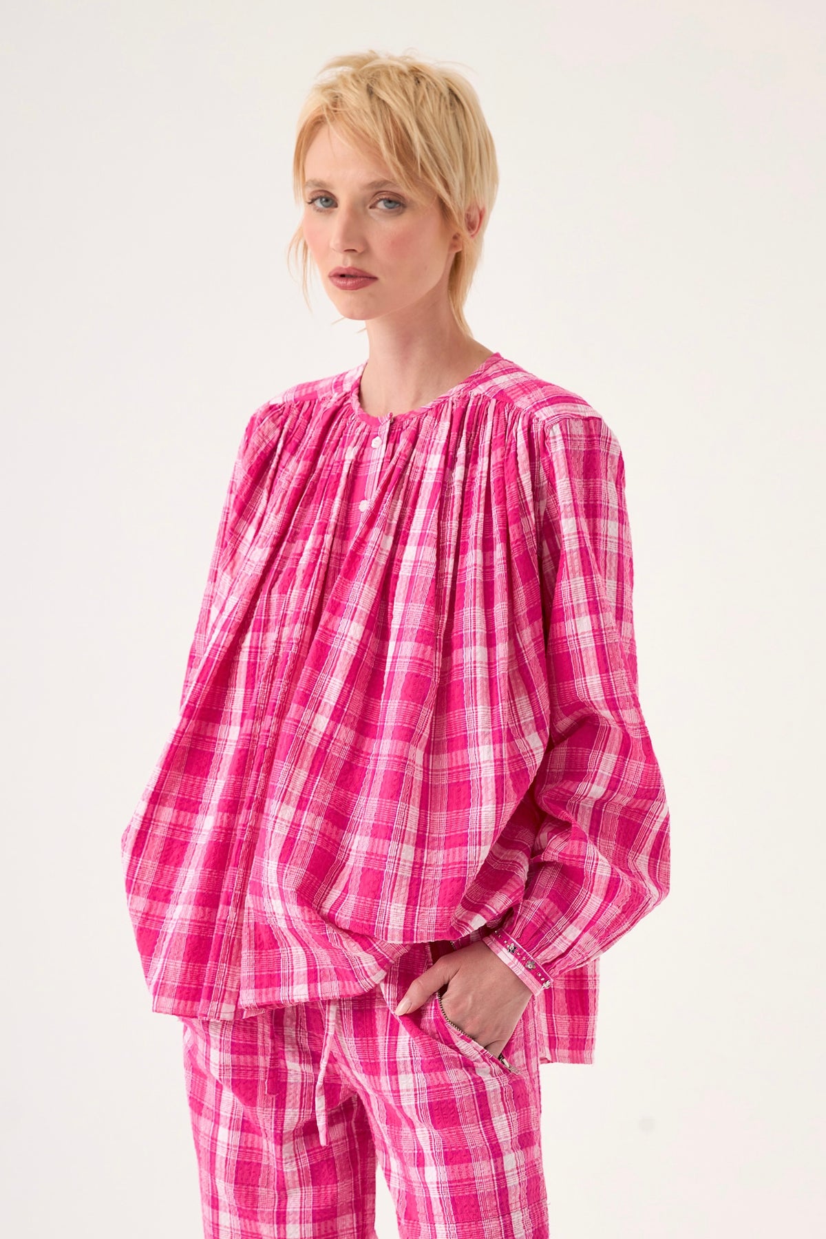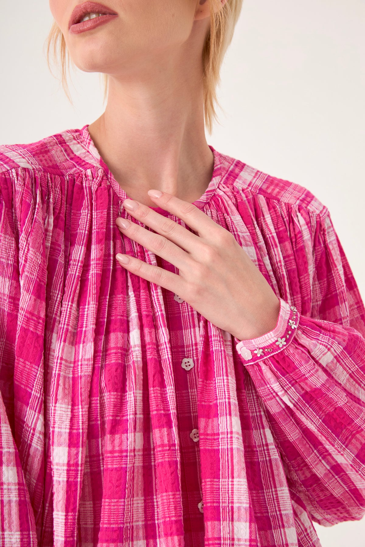 Cette chemise en coton au tissage à carreaux délicats marie confort et raffinement. Sa coupe ample est sublimée par des jeux de plissés et de fronces à l'avant comme à l'arrière, créant un volume aérien. Le col rond classique et les finitions bijoux aux poignets apportent une touche précieuse et sophistiquée.