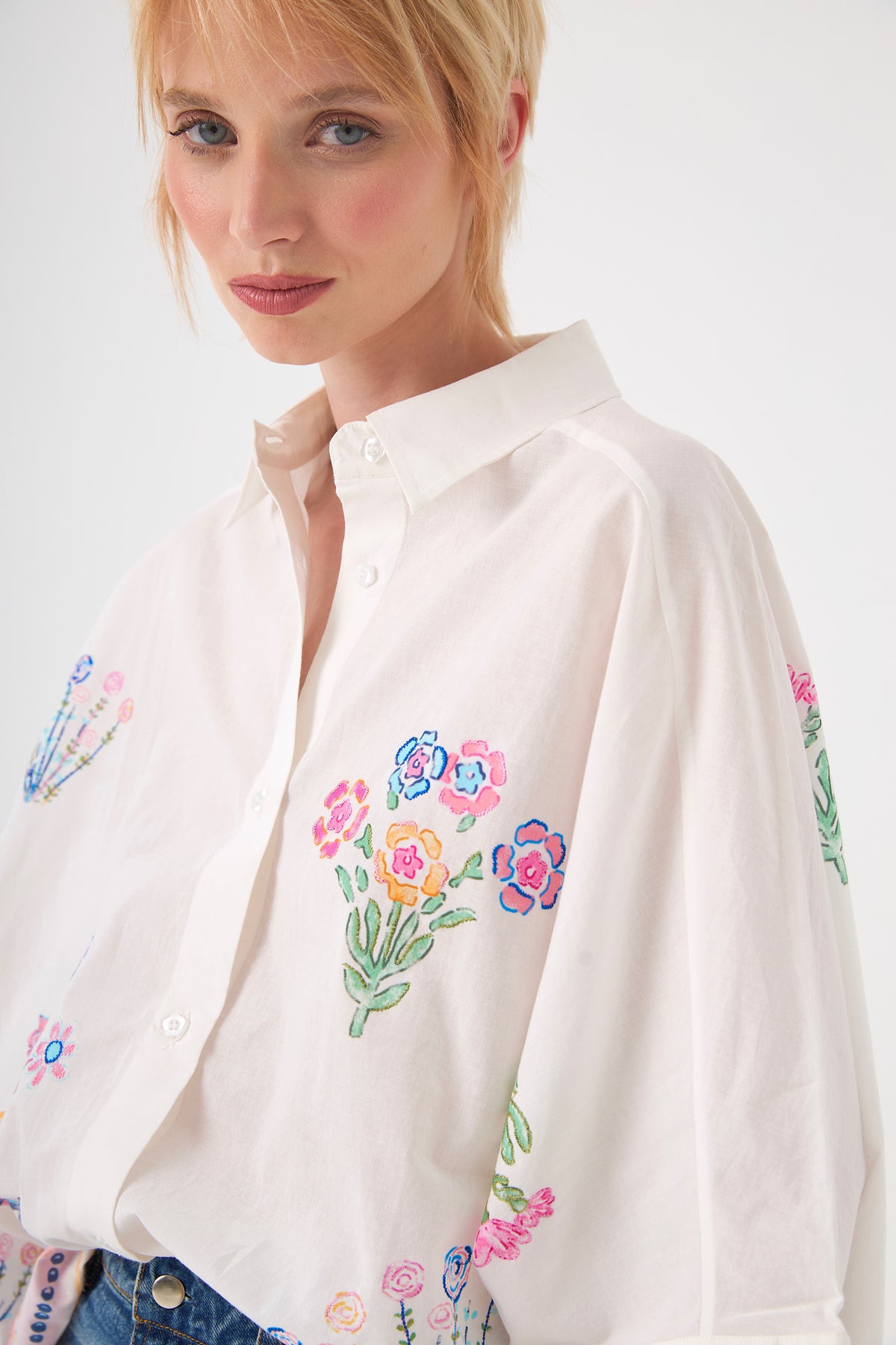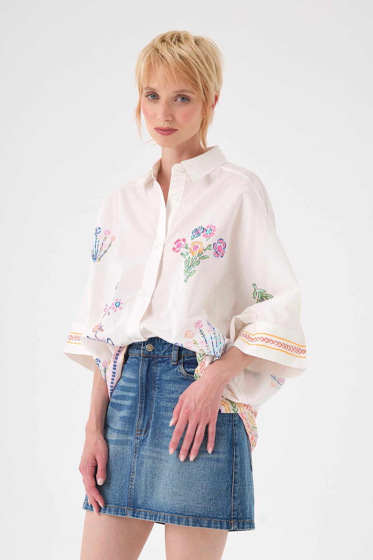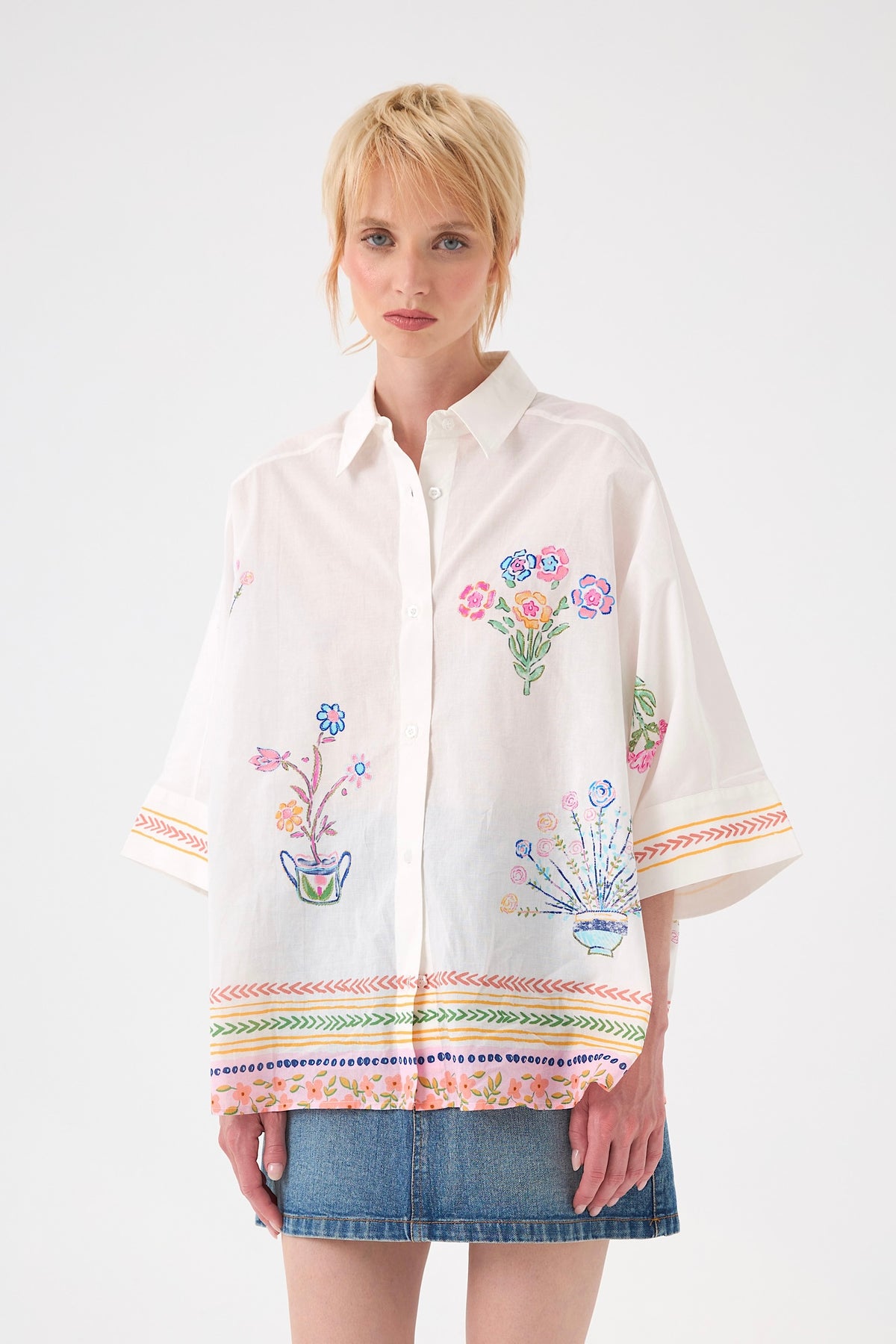 Laissez-vous charmer par cette chemise en coton blanc à la fois élégante et artistique. Sa coupe ample et ses manches trois-quarts évasées créent un volume moderne et aérien. Ornée de grandes fleurs brodées à l'avant et au dos, elle se distingue par son boutonnage floral délicat, offrant une allure romantique unique.
