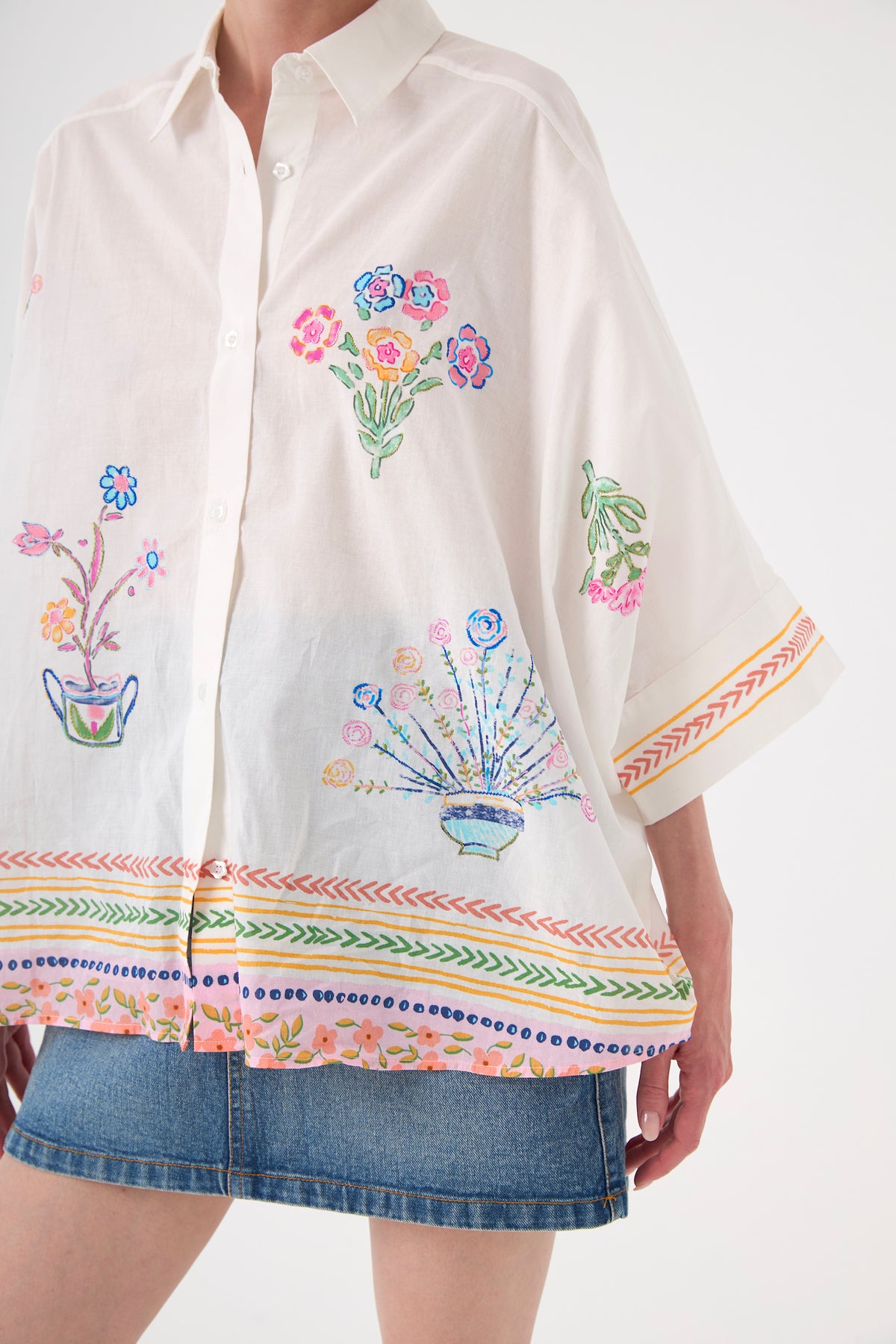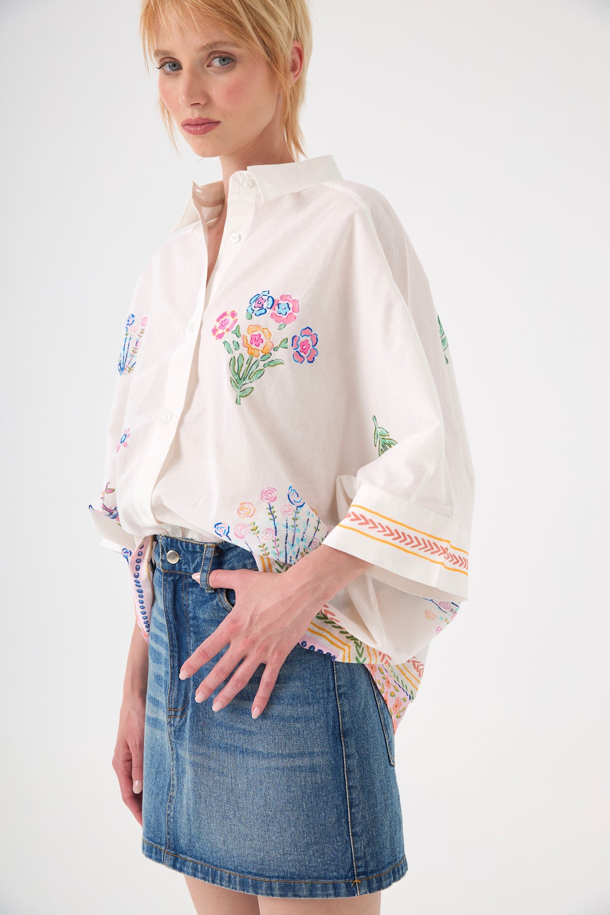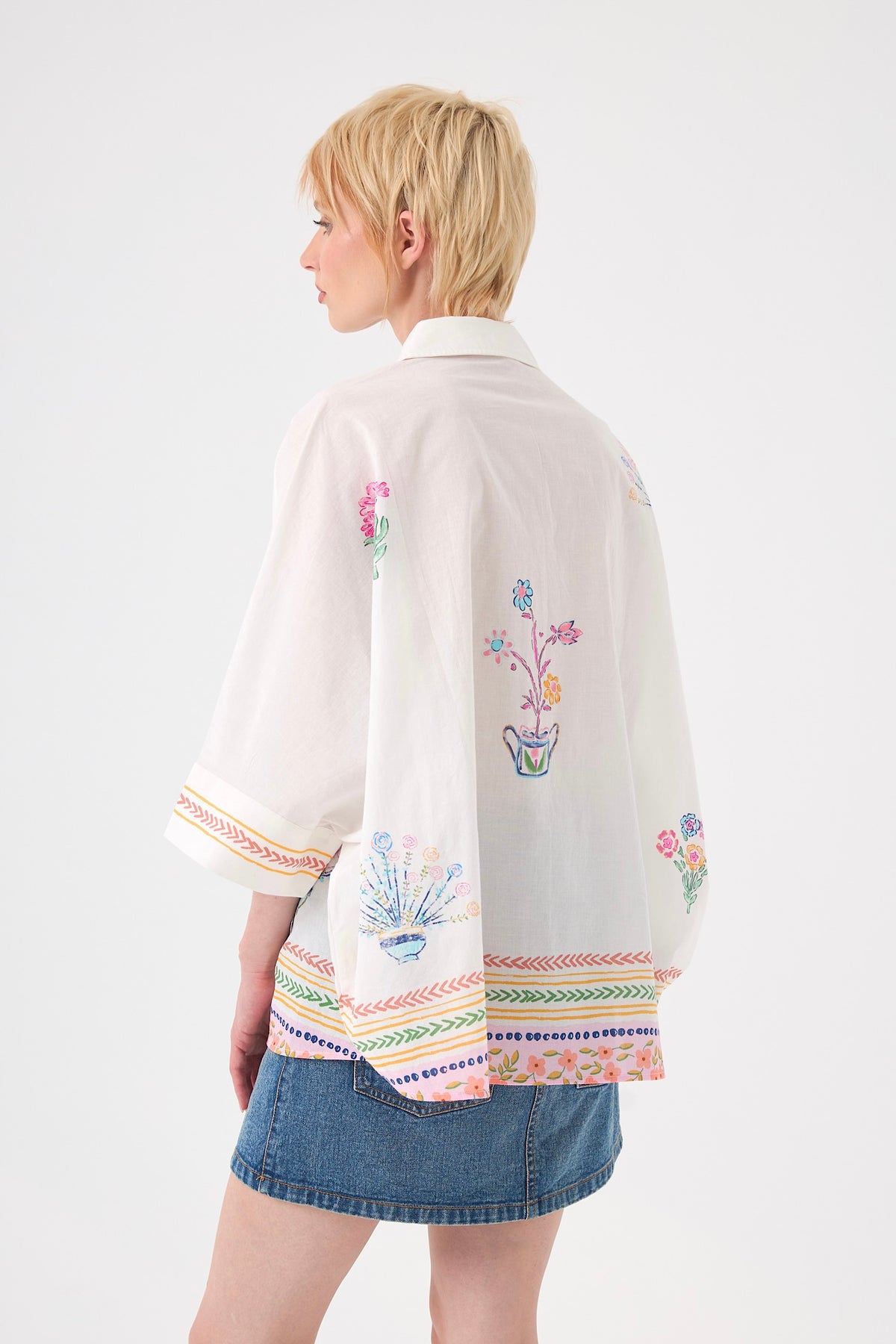 Laissez-vous charmer par cette chemise en coton blanc à la fois élégante et artistique. Sa coupe ample et ses manches trois-quarts évasées créent un volume moderne et aérien. Ornée de grandes fleurs brodées à l'avant et au dos, elle se distingue par son boutonnage floral délicat, offrant une allure romantique unique.