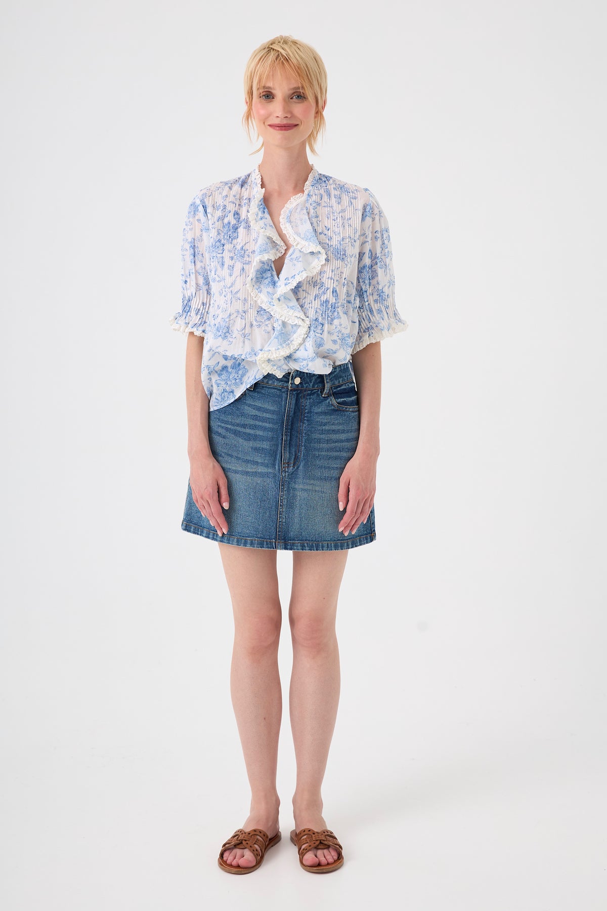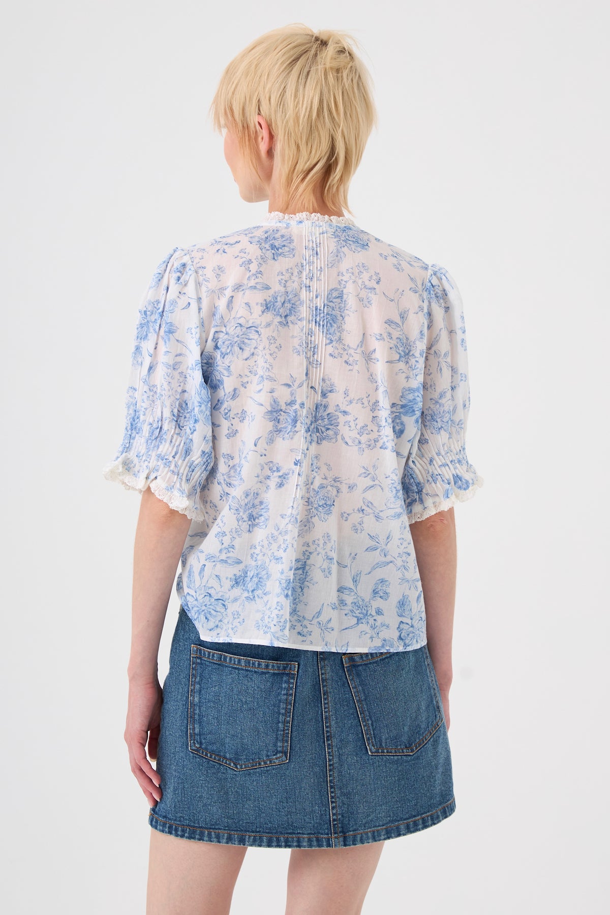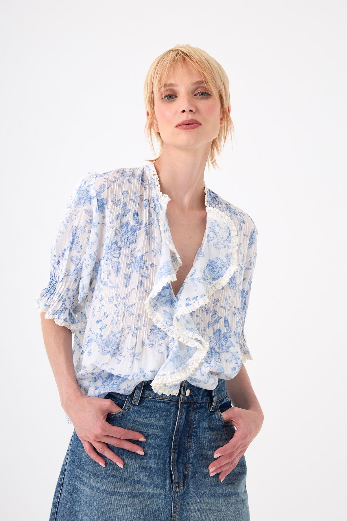Laissez-vous séduire par cette blouse au motif floral romantique en voile de coton, une pièce d'une finesse absolue qui joue sur les volumes et les textures. Sa coupe ample est magnifiée par un boutonnage volanté et des finitions précieuses mêlant plissés délicats et dentelles raffinées sur le devant, le col et les manches.