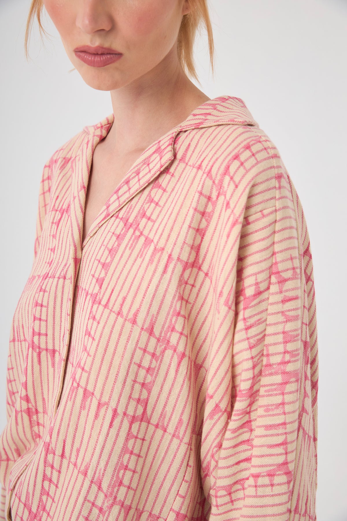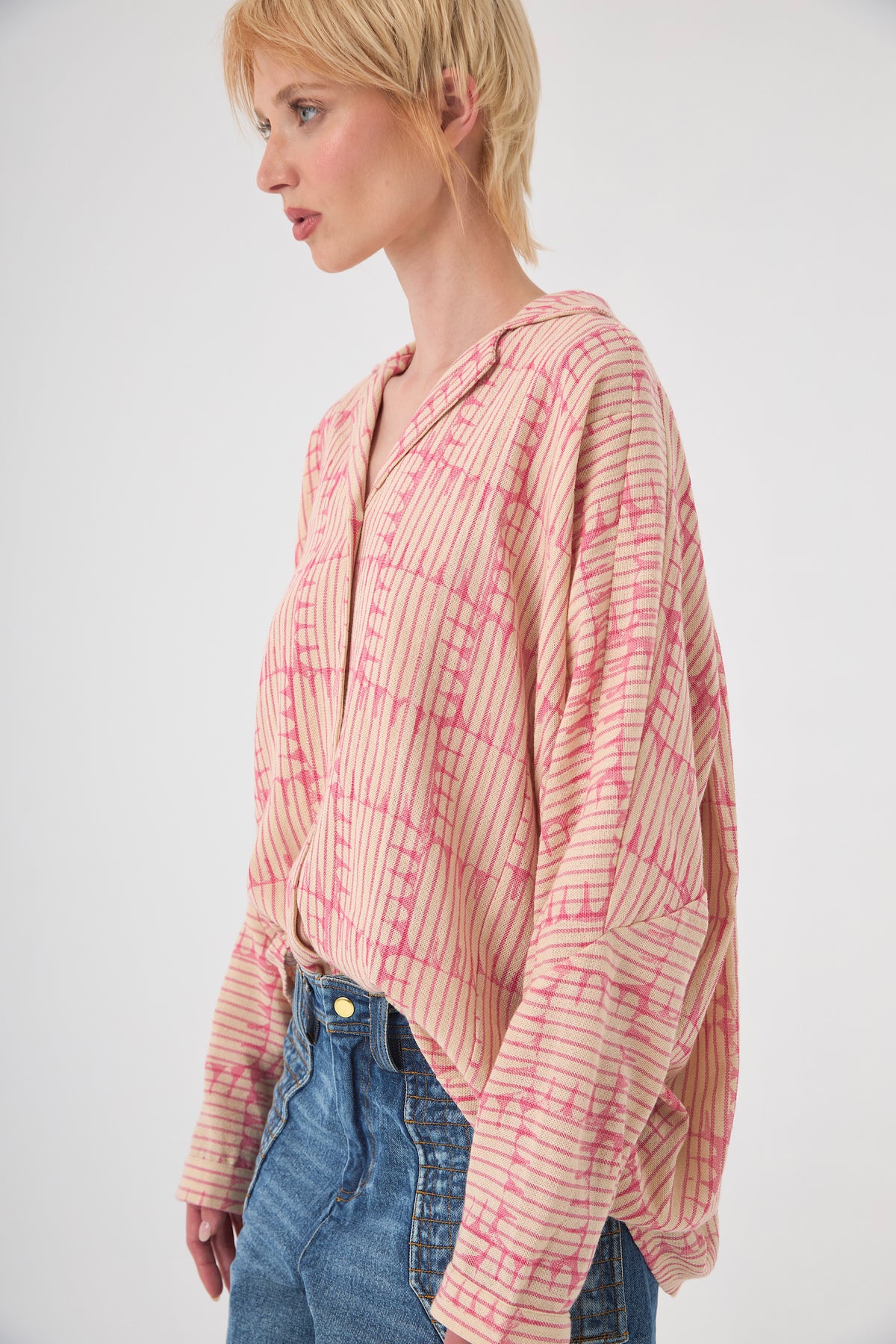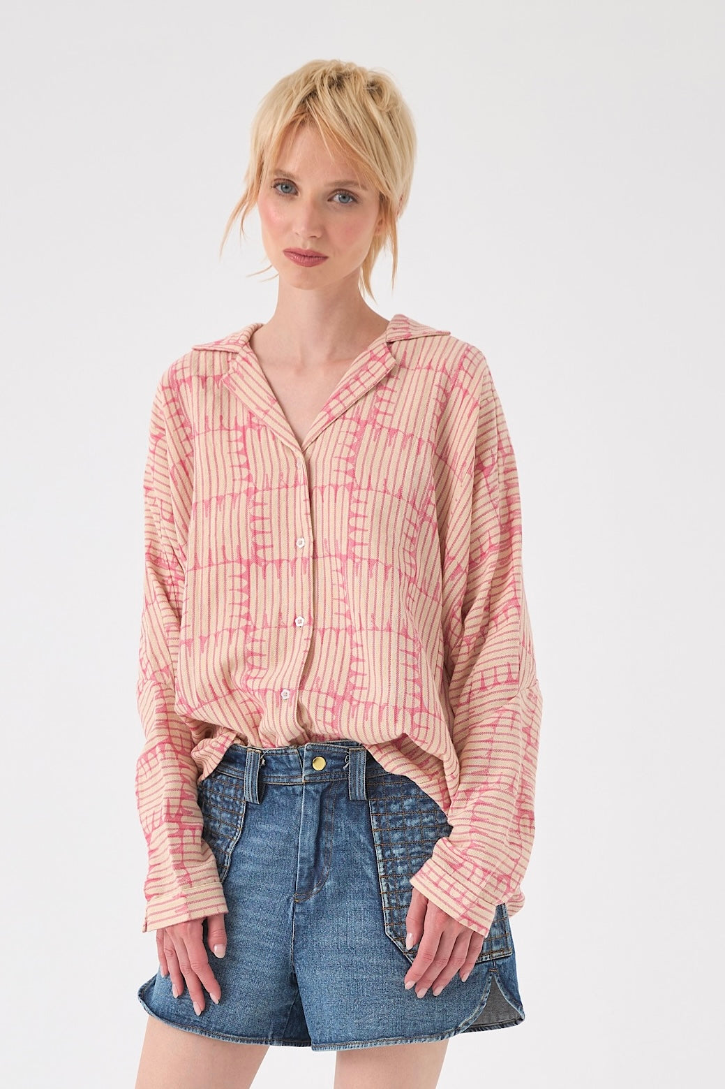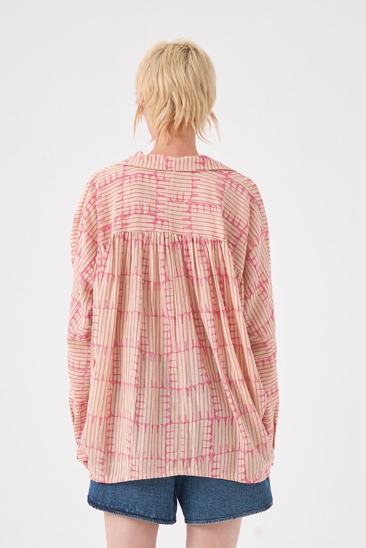 Laissez-vous séduire par cette chemise oversize en coton au caractère unique. Son motif graphique, imprimé au block print sur un élégant tissu à fines rayures, crée un jeu de textures visuel moderne et singulier. Son encolure en V à revers et ses boutons fleurs parachèvent cette silhouette à la fois décontractée et poétique.