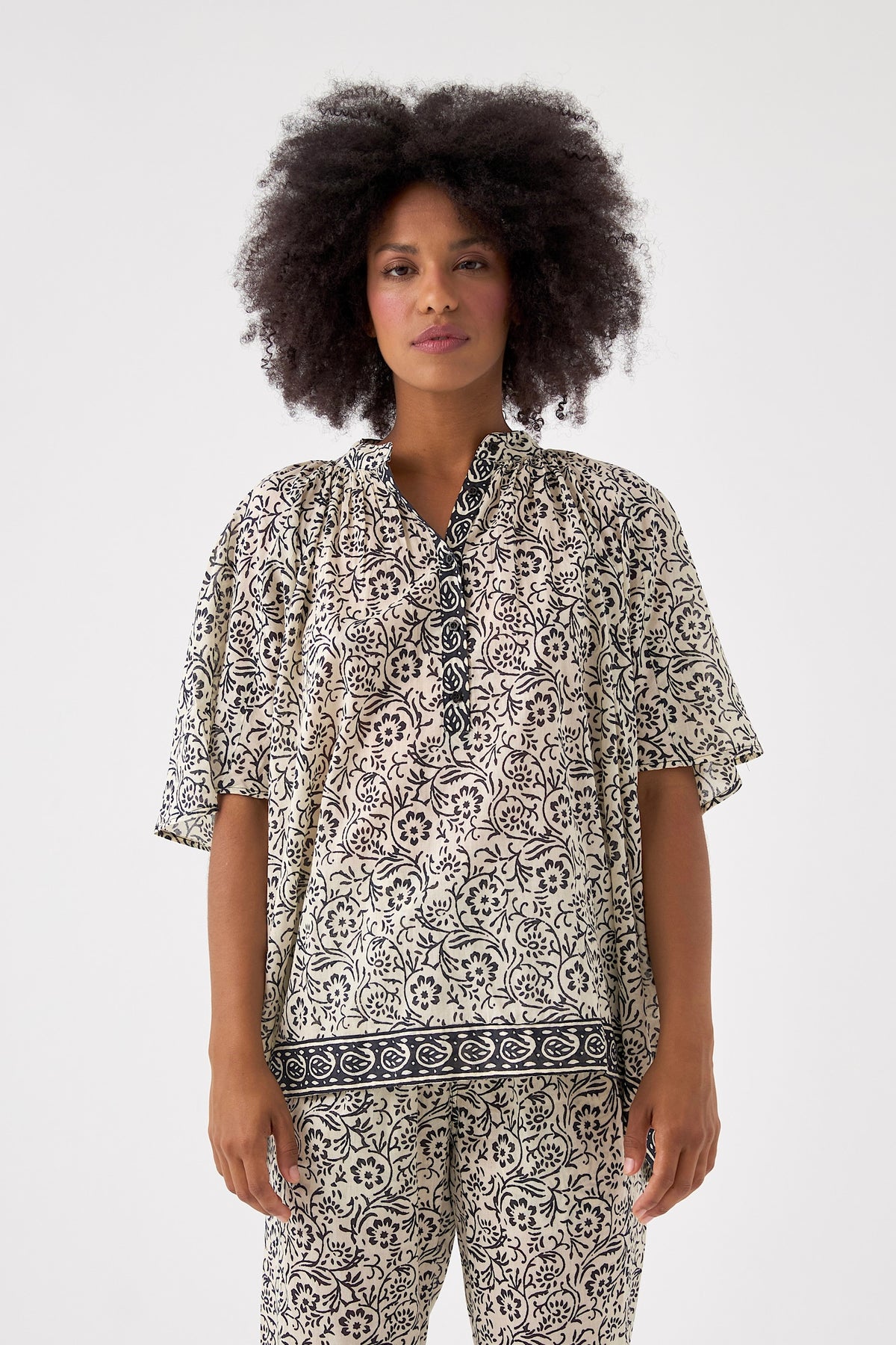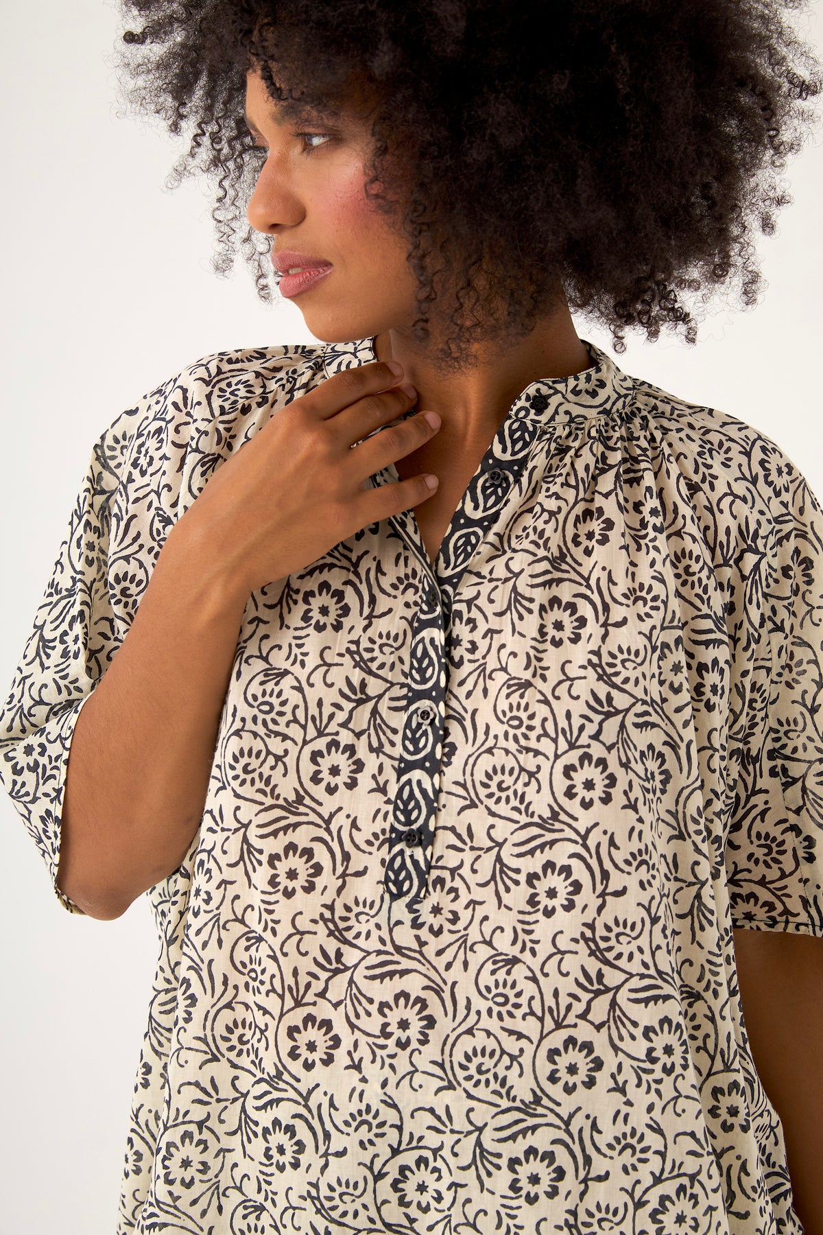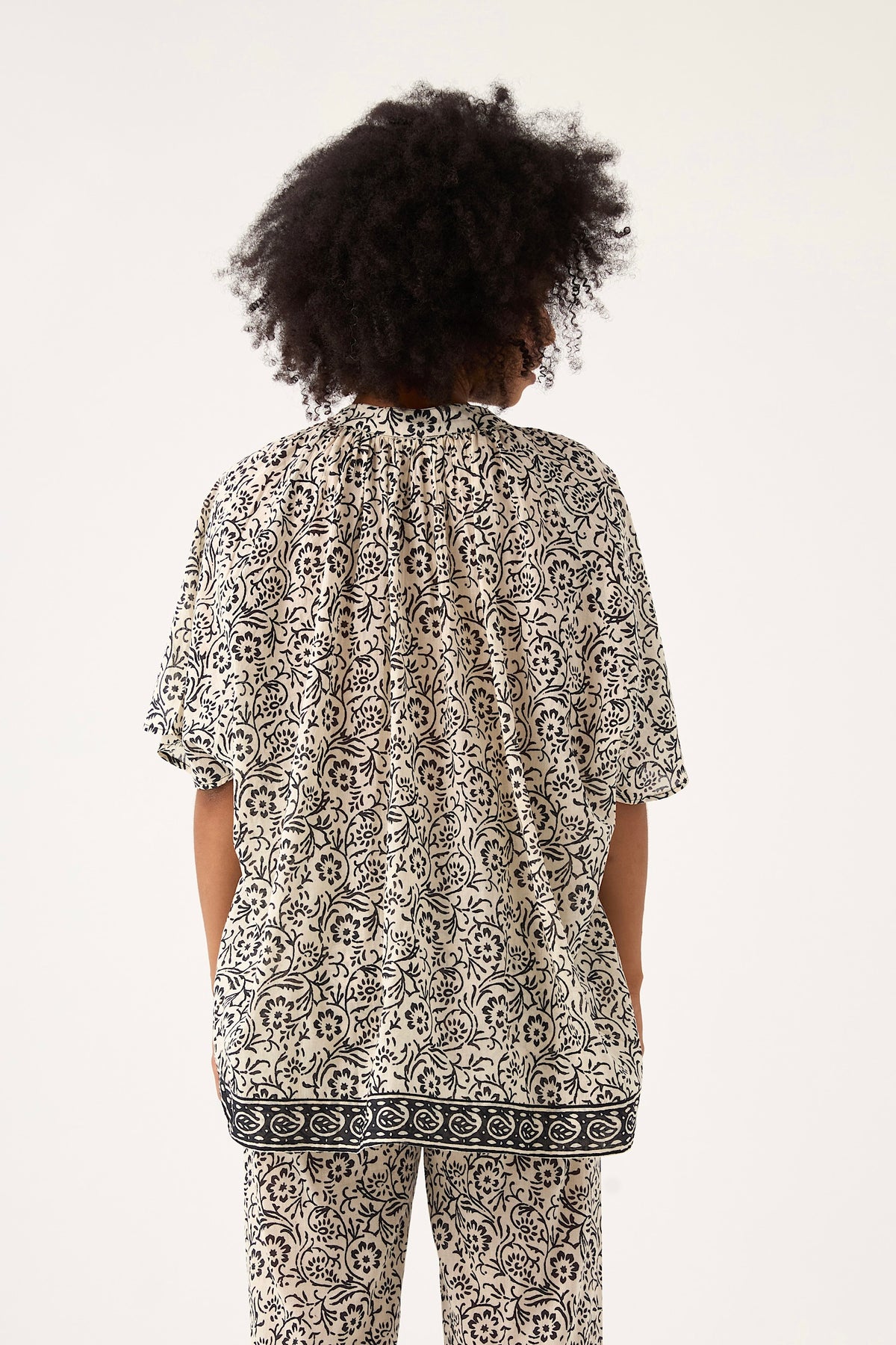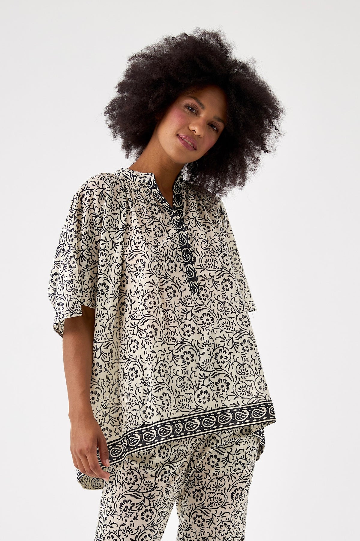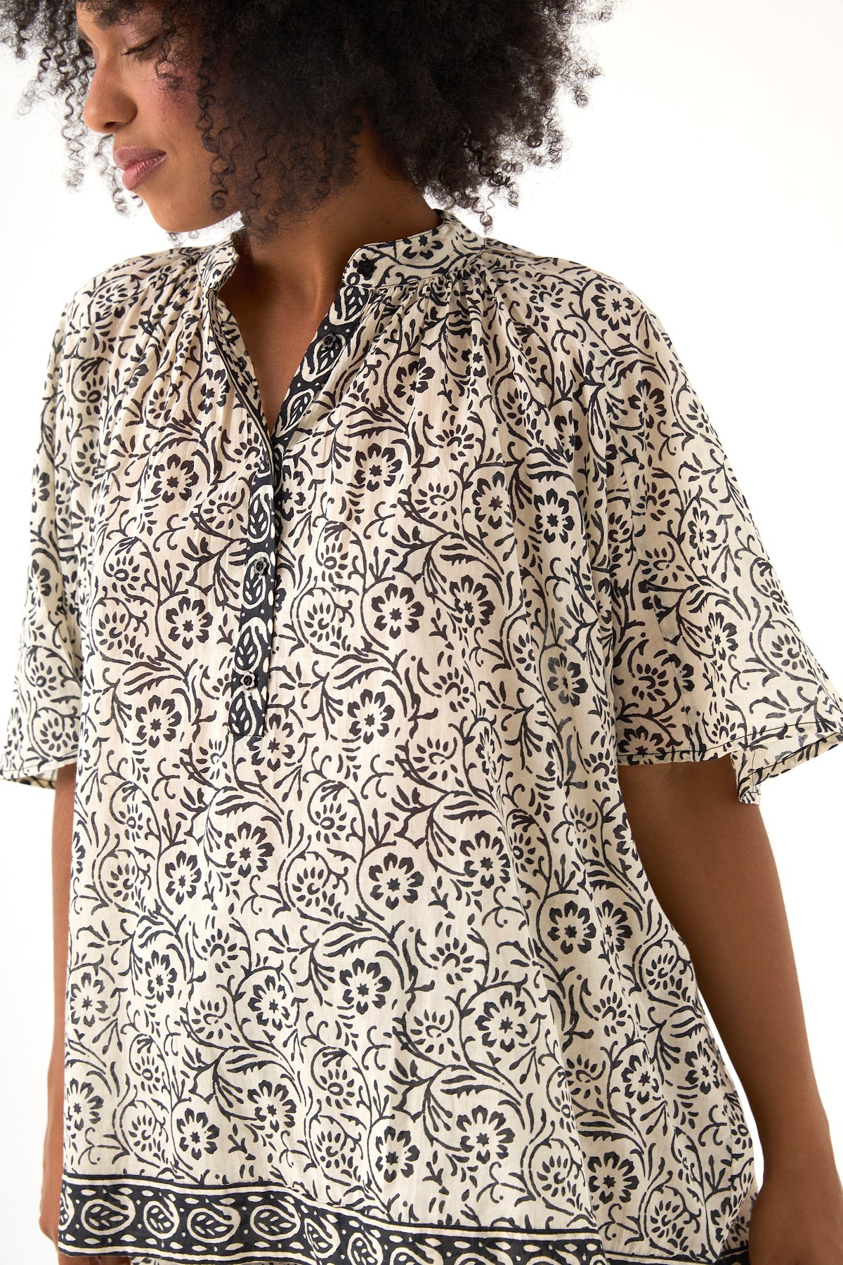 Laissez-vous séduire par ce top oversize en coton au caractère solaire et estival. Sa coupe généreuse est sublimée par des épaules froncées et des manches courtes amples qui créent un volume aérien et moderne. Son col rond boutonné et son motif floral exotique apportent une touche de fraîcheur féminine à votre vestiaire de saison.