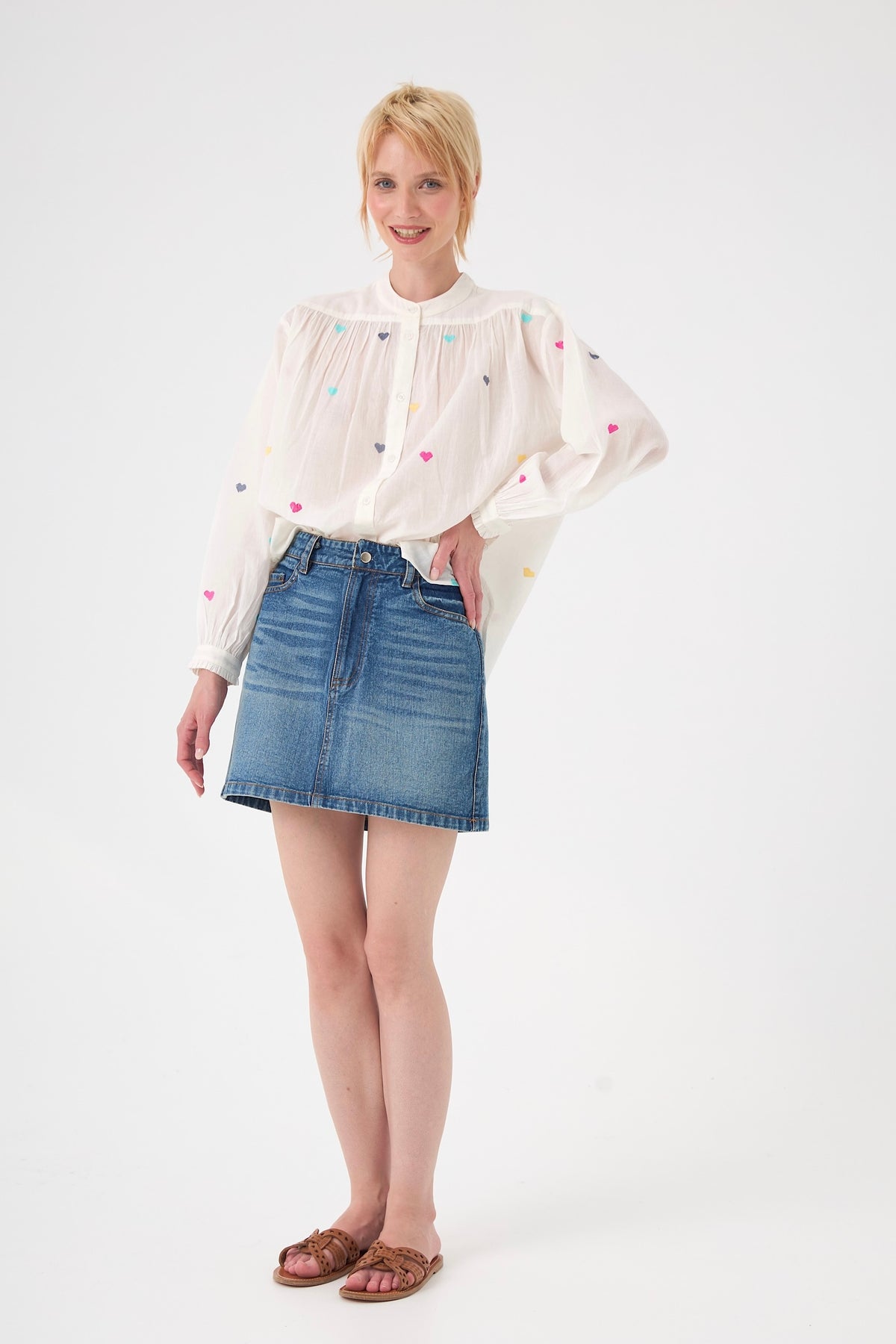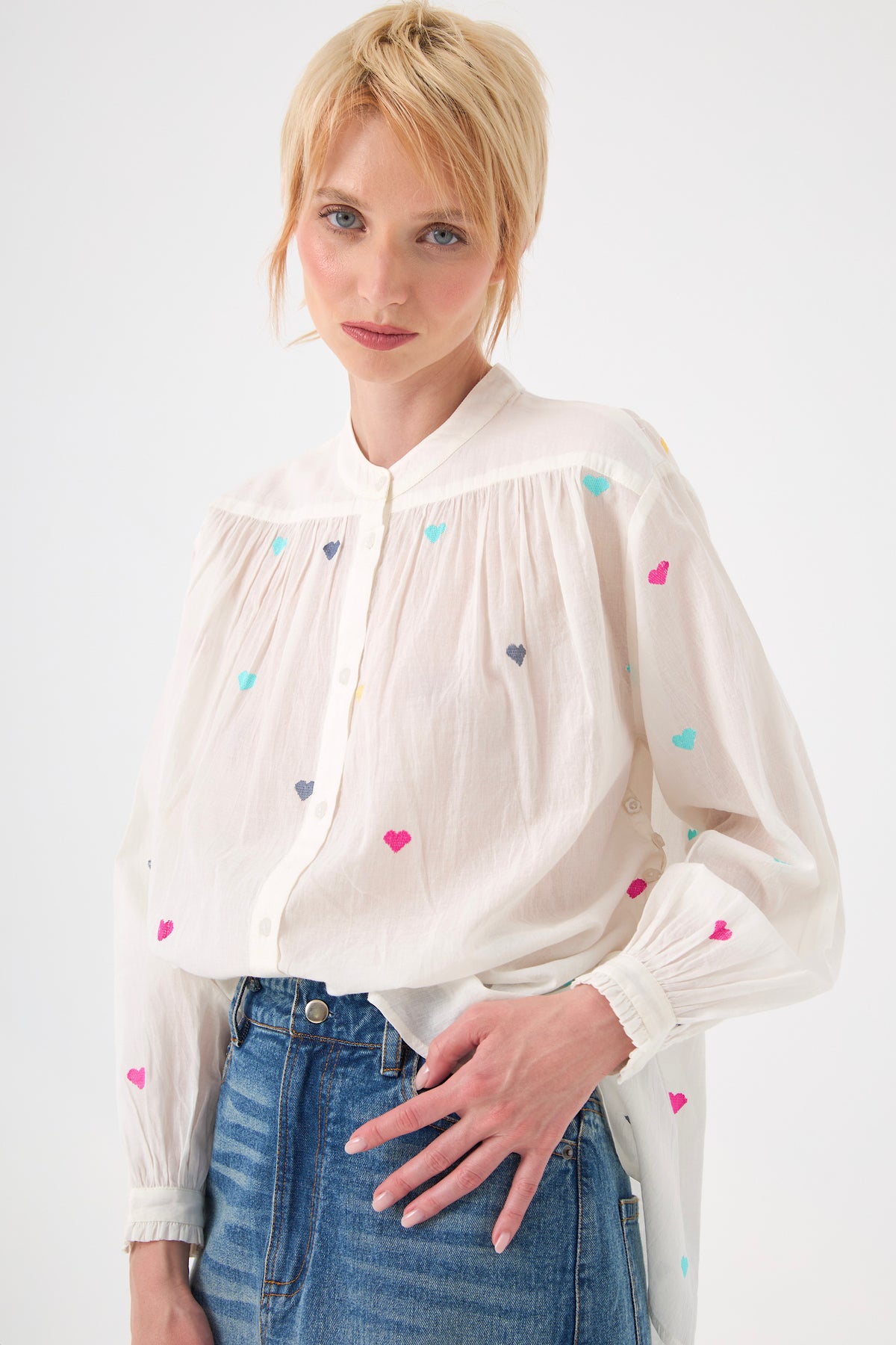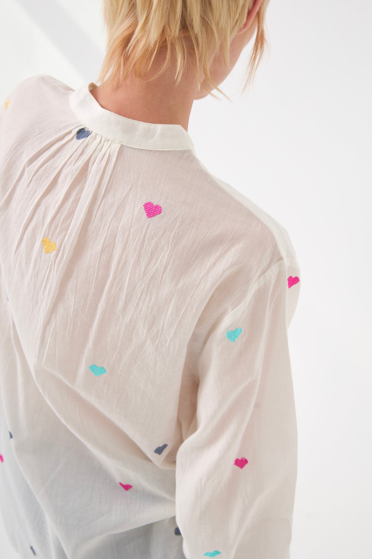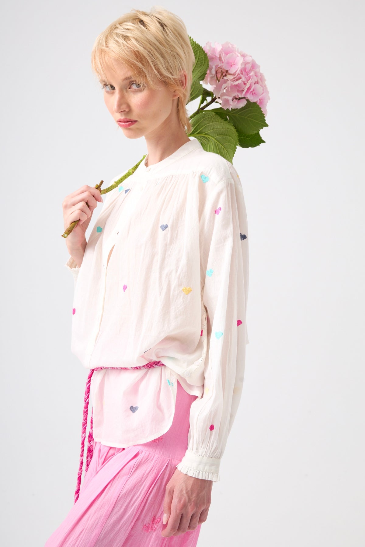 Laissez-vous séduire par ce top en coton au charme irrésistible, sublimé par des broderies cœurs multicolores. Sa coupe droite est agrémentée de fronces délicates et de manches volantées qui apportent un volume poétique. Les finitions raffinées, comme le boutonnage fleurs sur le devant et les côtés, signent une allure féminine et ludique.