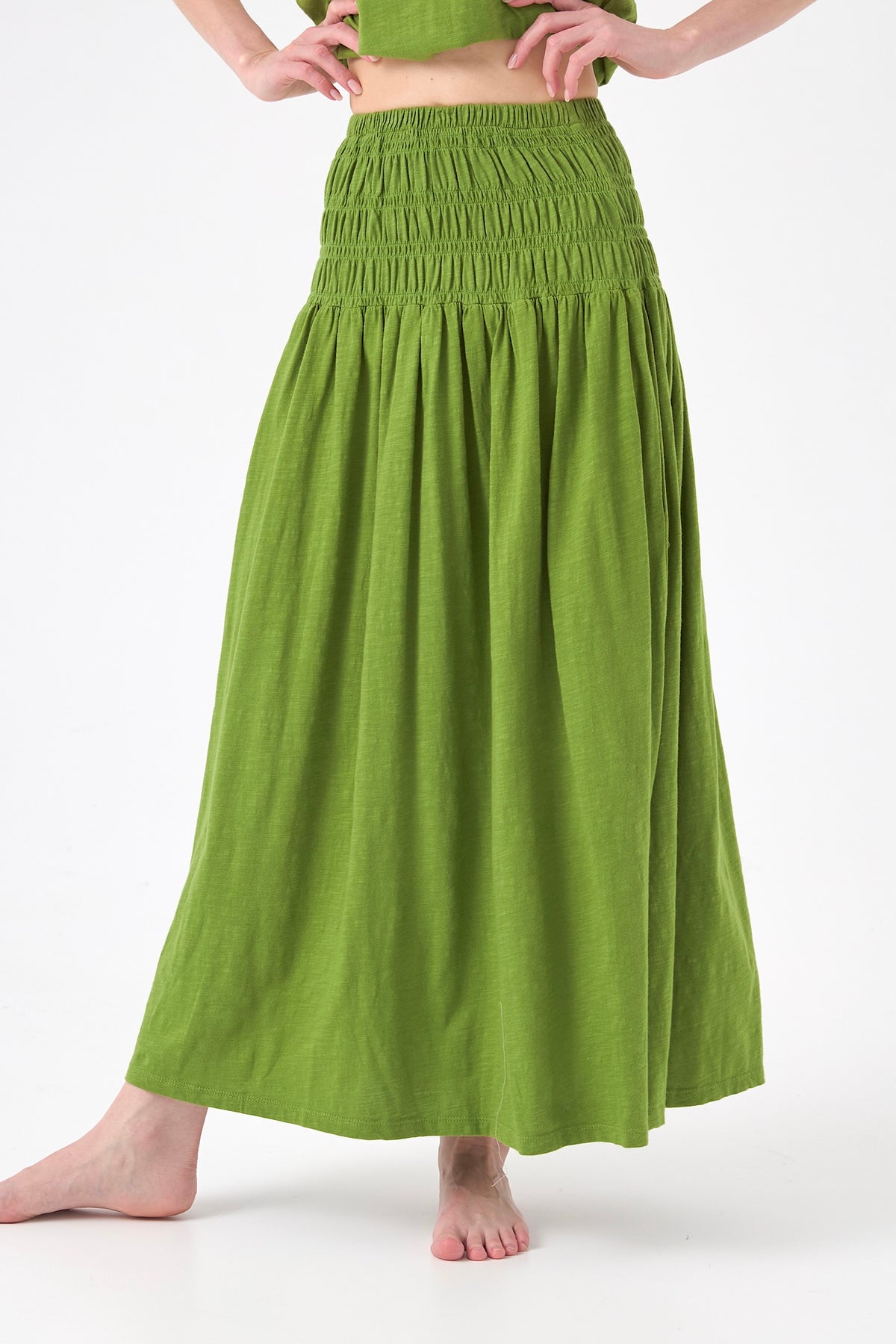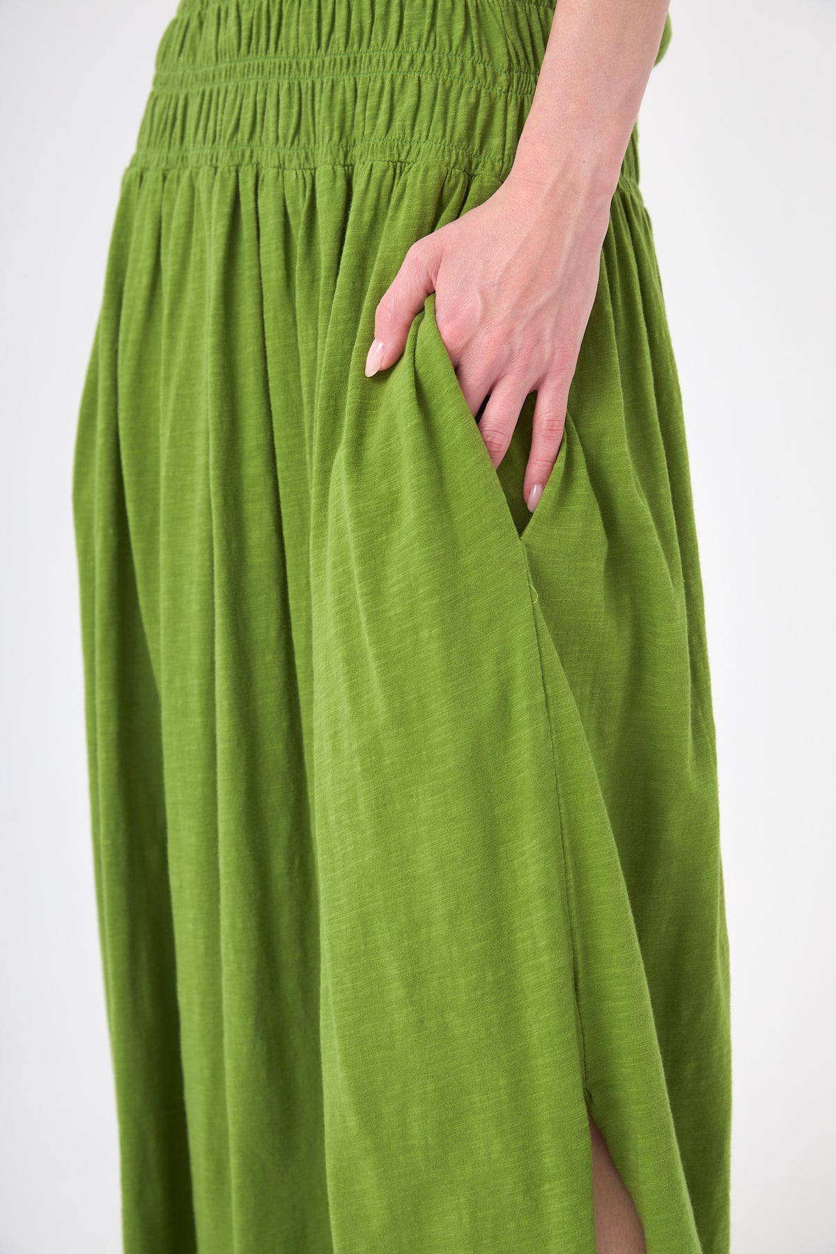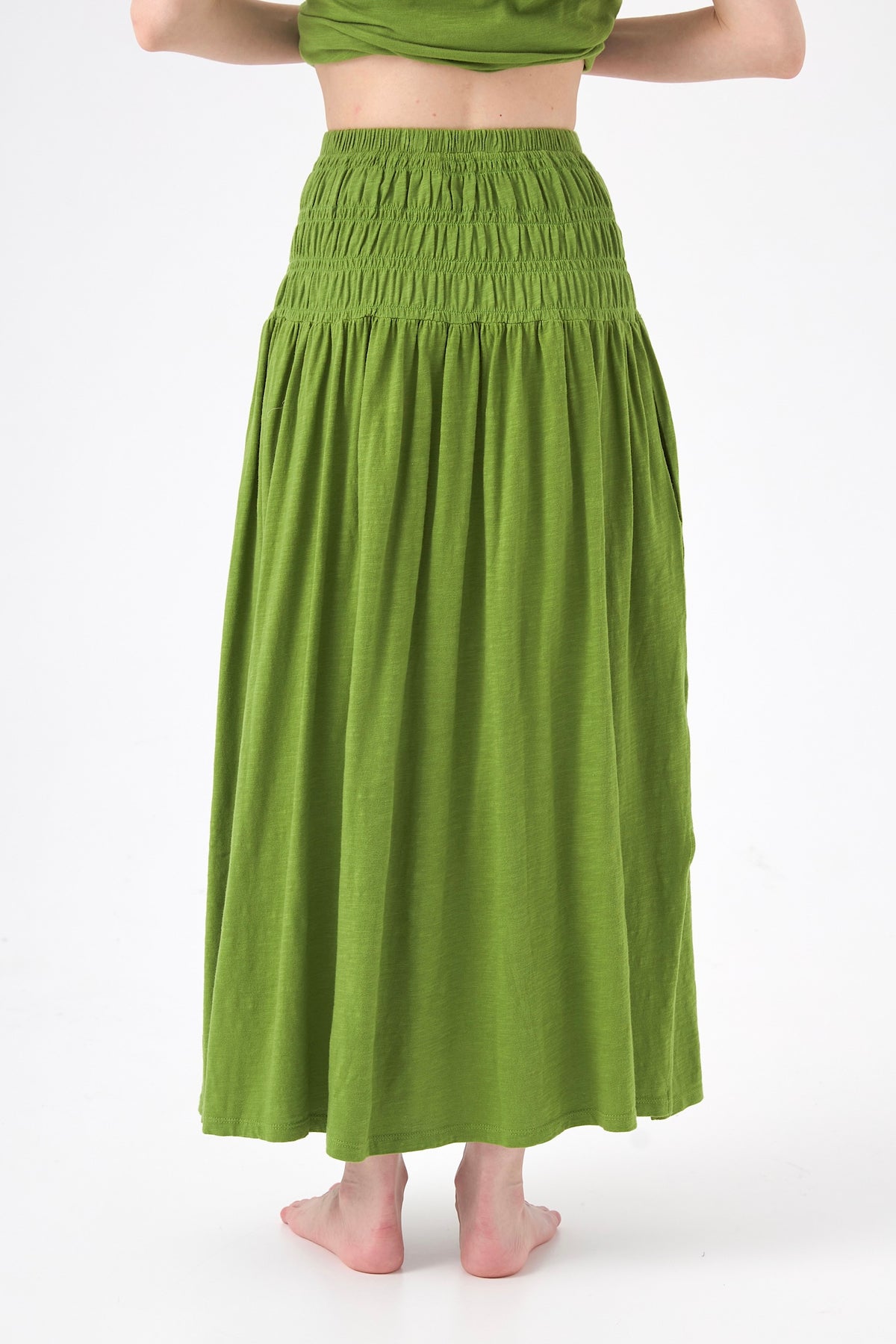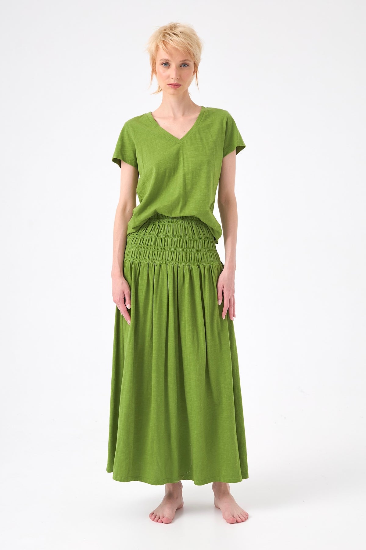 Cette jupe longue en flanelle de coton réinterprète l'esprit "jupe T-shirt" avec une simplicité parfaitement maîtrisée. Sa coupe évasée offre une allure décontractée et un mouvement fluide, tandis que le travail des smocks à la taille apporte une note de style subtile. C’est la pièce facile à vivre par excellence, idéale pour une silhouette estivale naturelle et sans effort.