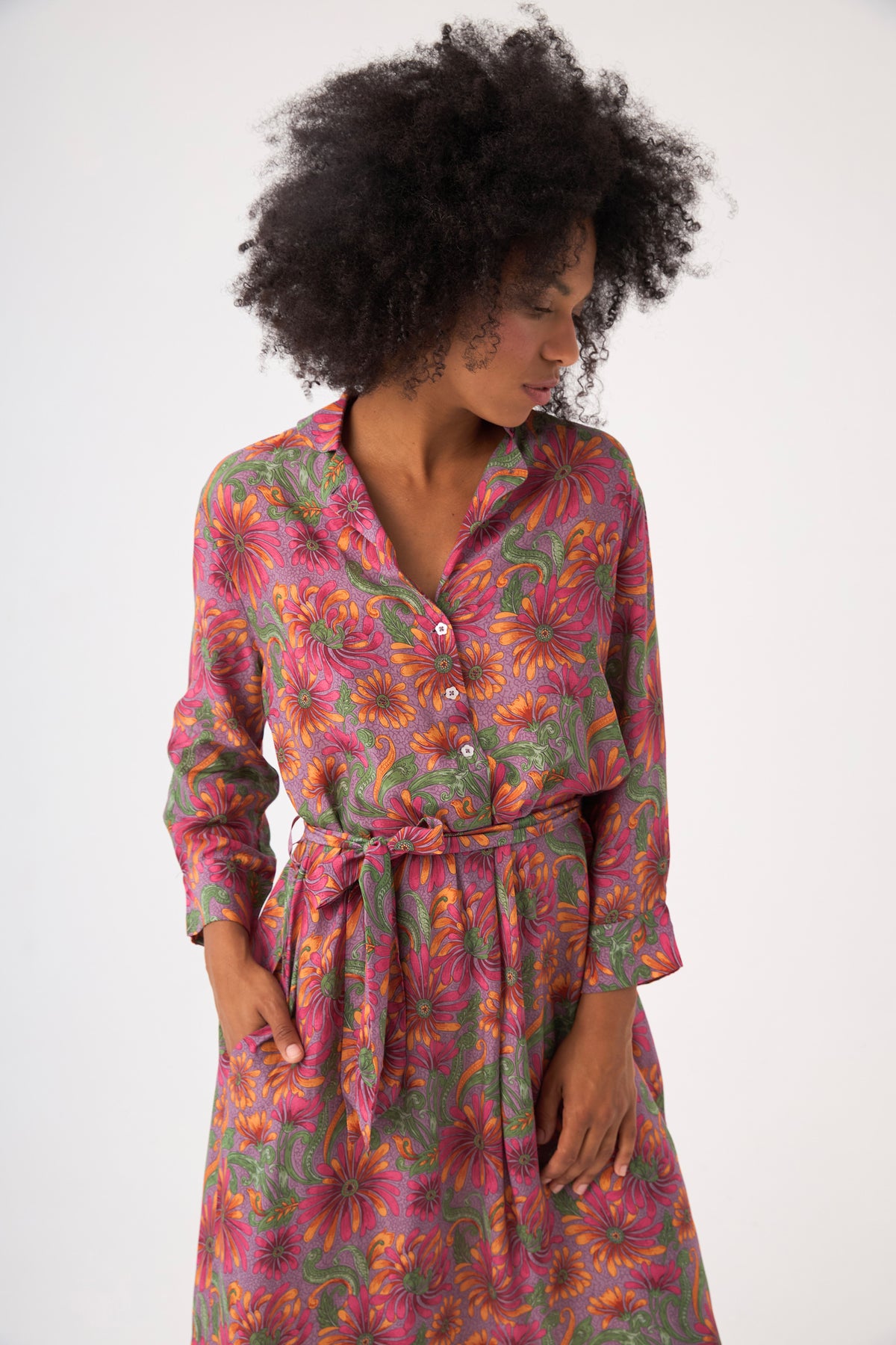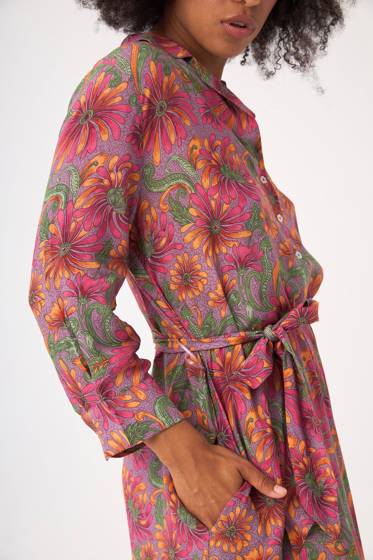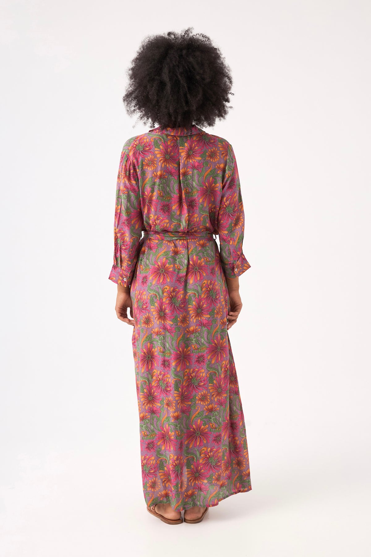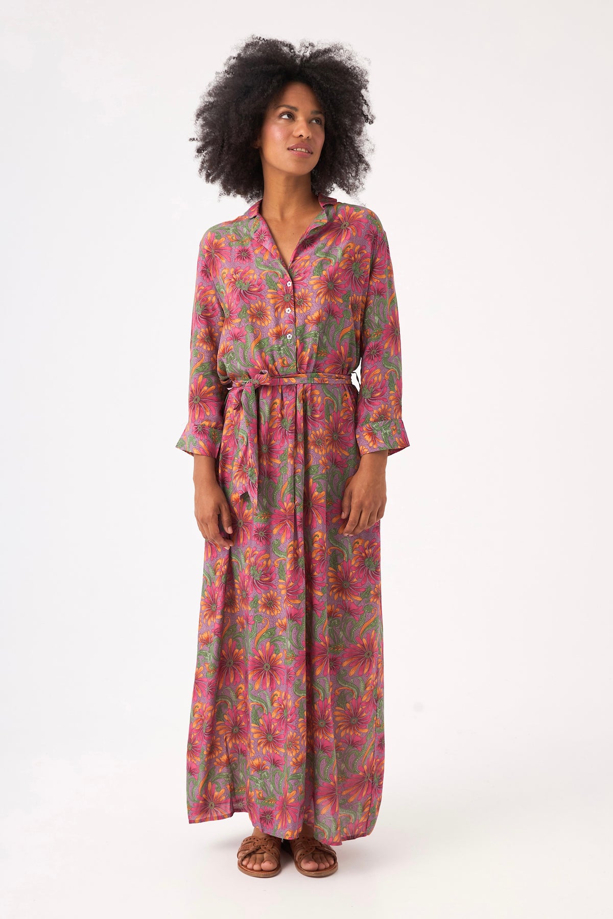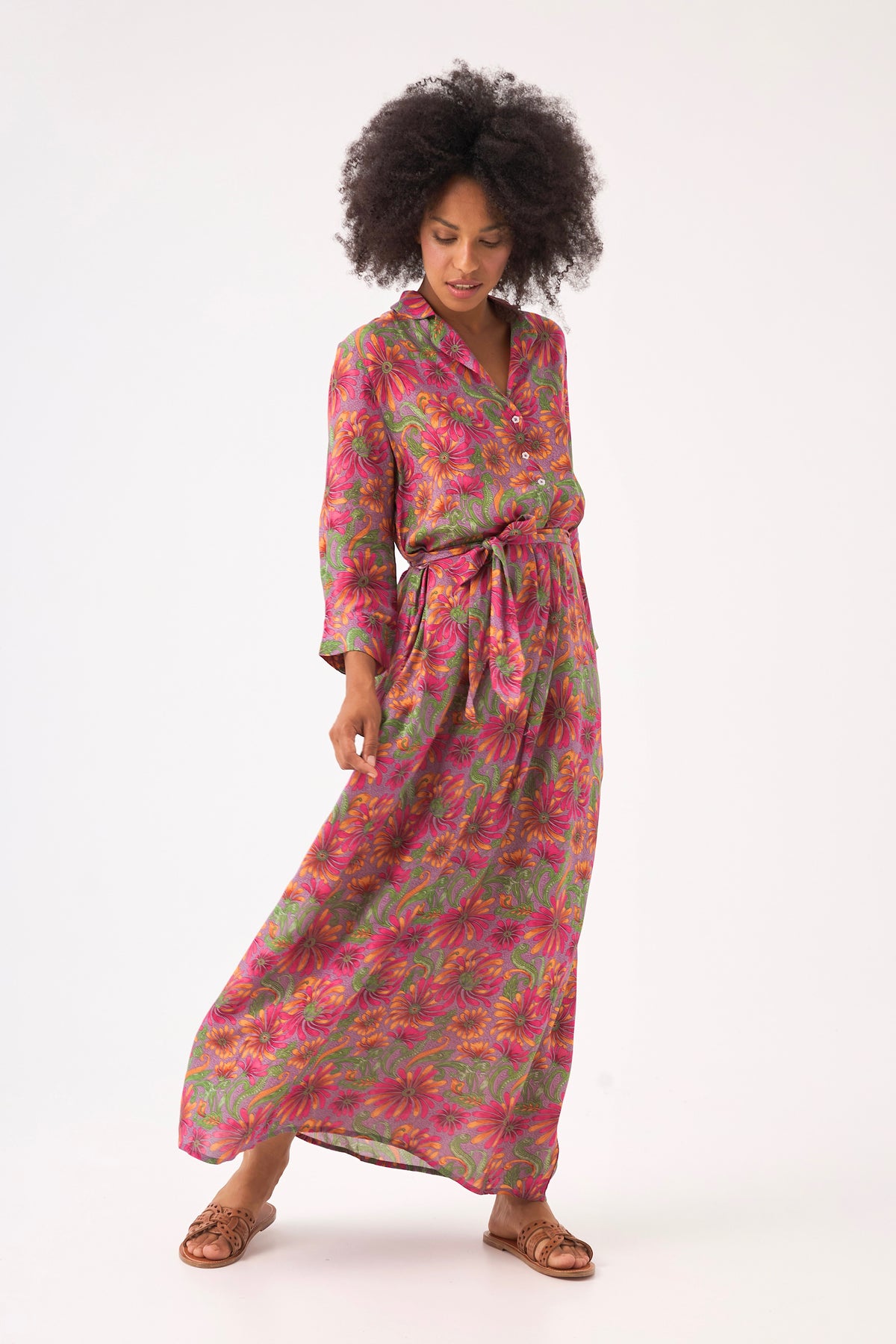 Cette robe chemise longue en satin de viscose se distingue par son tombé fluide et son éclat délicat qui accroche la lumière. Sa coupe droite, structurée par un boutonnage frontal et une ceinture coordonnée, assure une silhouette chic et moderne.