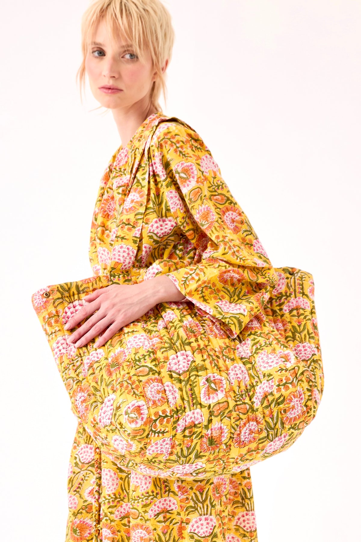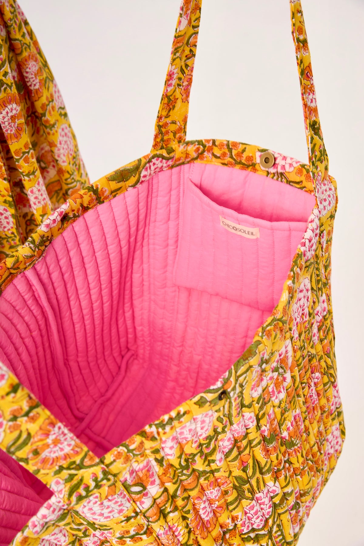 Ce grand sac matelassé est l'accessoire idéal pour celles qui recherchent un volume généreux sans compromis sur le style. Confectionné en coton dobby, il arbore l'imprimé "Gypsy Batik" réalisé à la main en block print. Ses surpiqûres orange contrastantes lui donnent du relief et de la tenue, tandis que son intérieur rose avec poche intégrée et sa fermeture aimantée en font un sac aussi pratique qu'esthétique pour le quotidien.