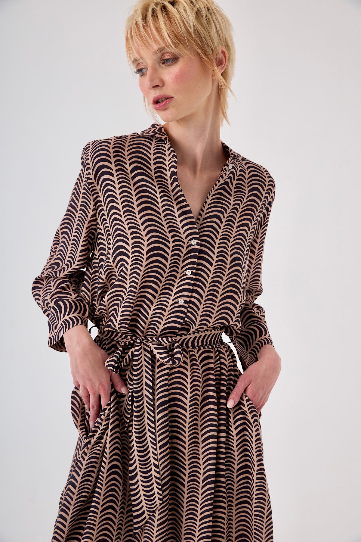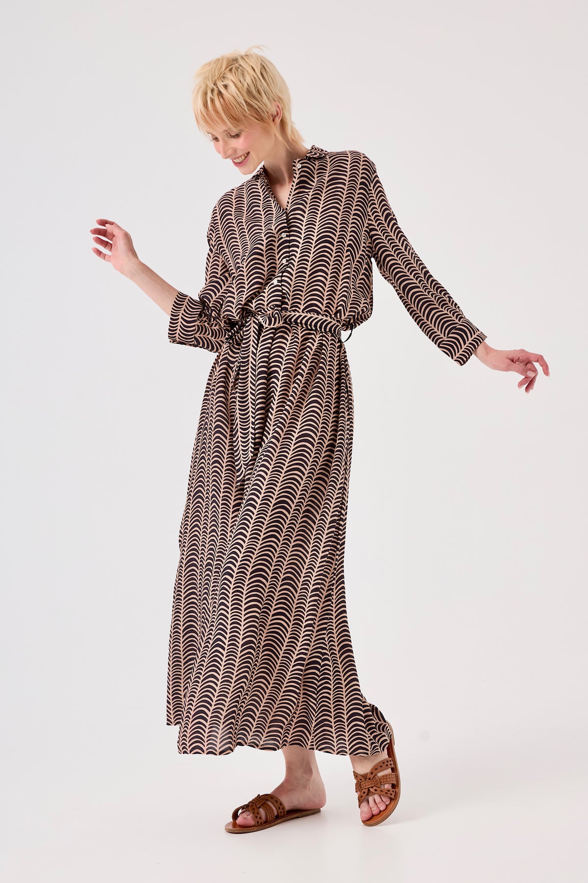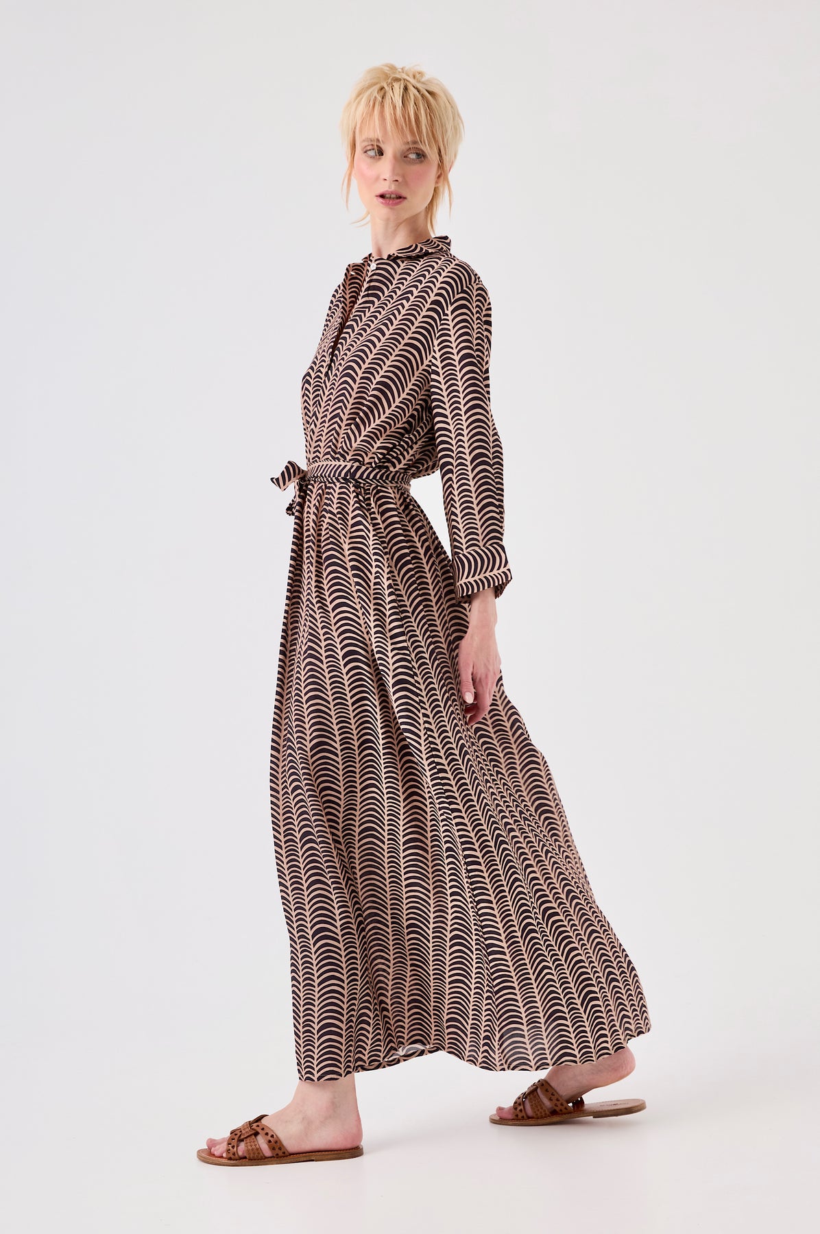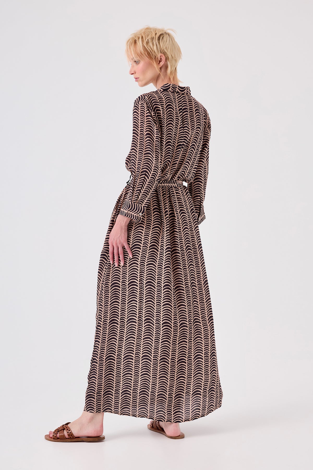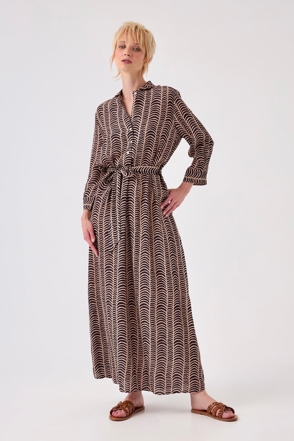 Cette robe chemise longue en satin de viscose se distingue par son tombé fluide et son éclat délicat qui accroche la lumière. Sa coupe droite, structurée par un boutonnage frontal et une ceinture coordonnée, assure une silhouette chic et moderne.