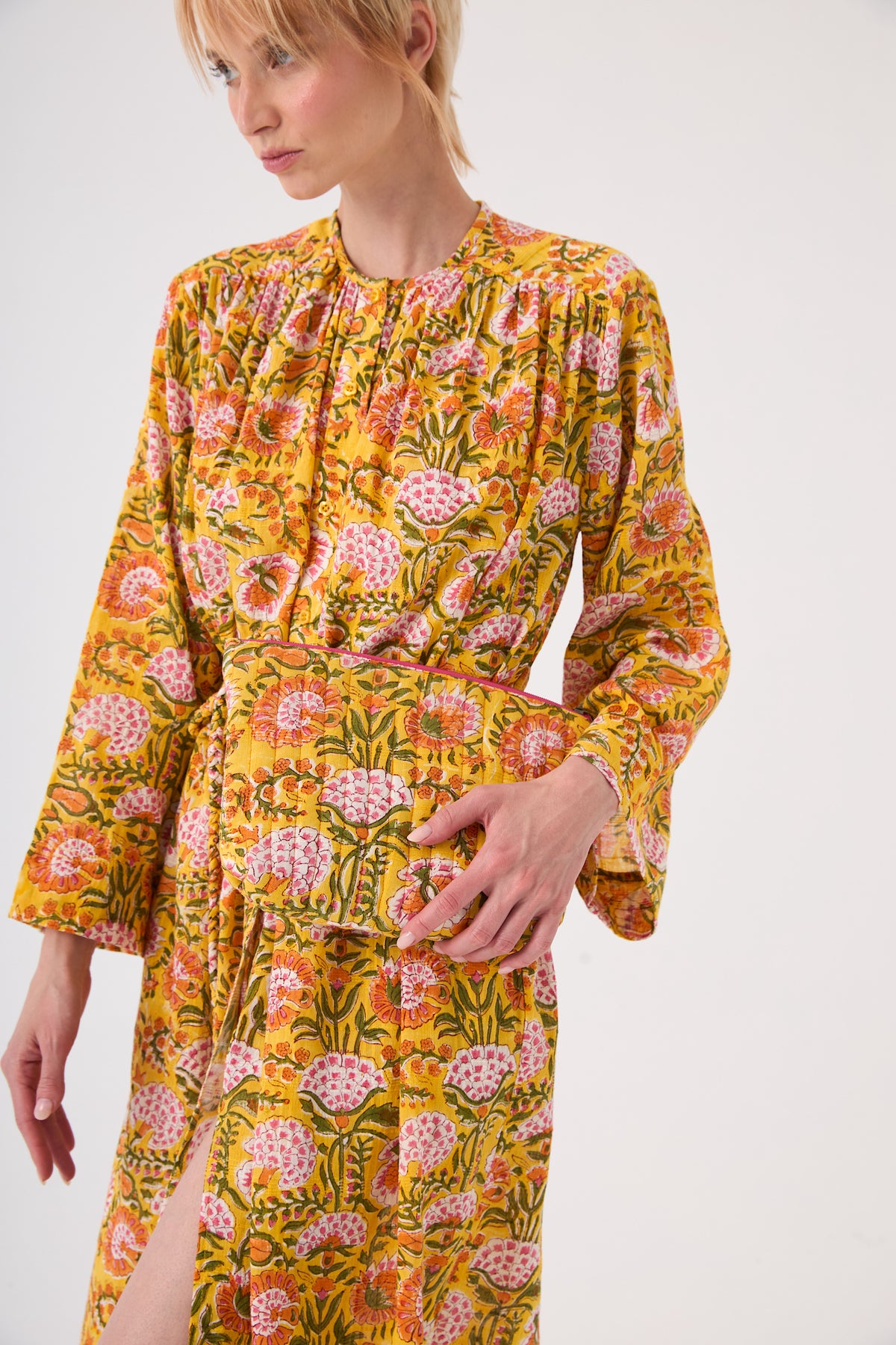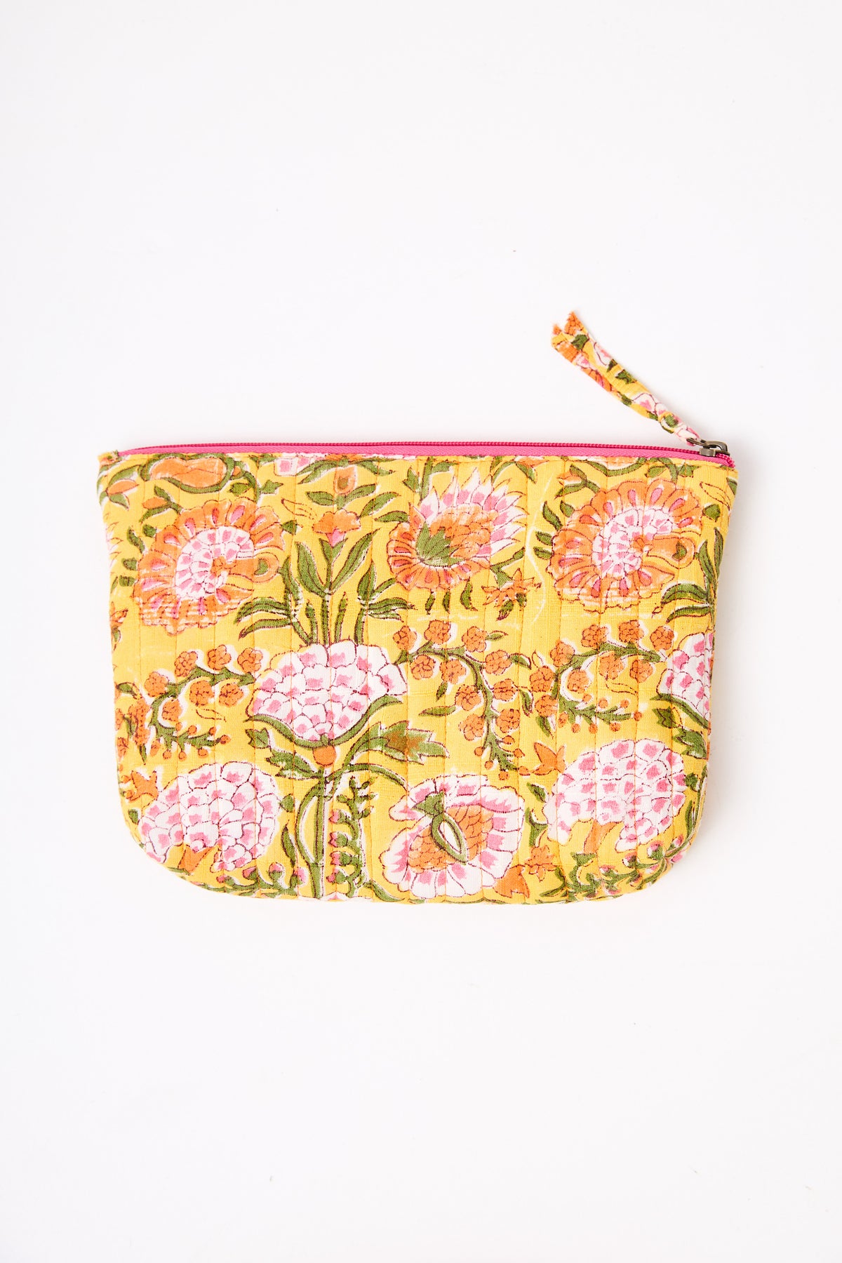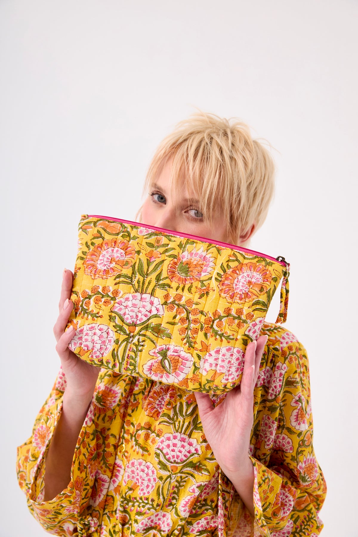 Cette grande pochette matelassée allie savoir-faire artisanal et praticité absolue. Confectionnée en coton dobby, elle arbore l'imprimé exclusif "Gypsy Batik", réalisé entièrement à la main selon la technique traditionnelle du block print. Ses surpiqûres orange contrastantes soulignent son design généreux, tandis que son intérieur ingénieux, doublé d'un film de protection transparent, protège vos essentiels avec élégance. Une pièce unique et vibrante qui vous accompagnera dans tous vos voyages.