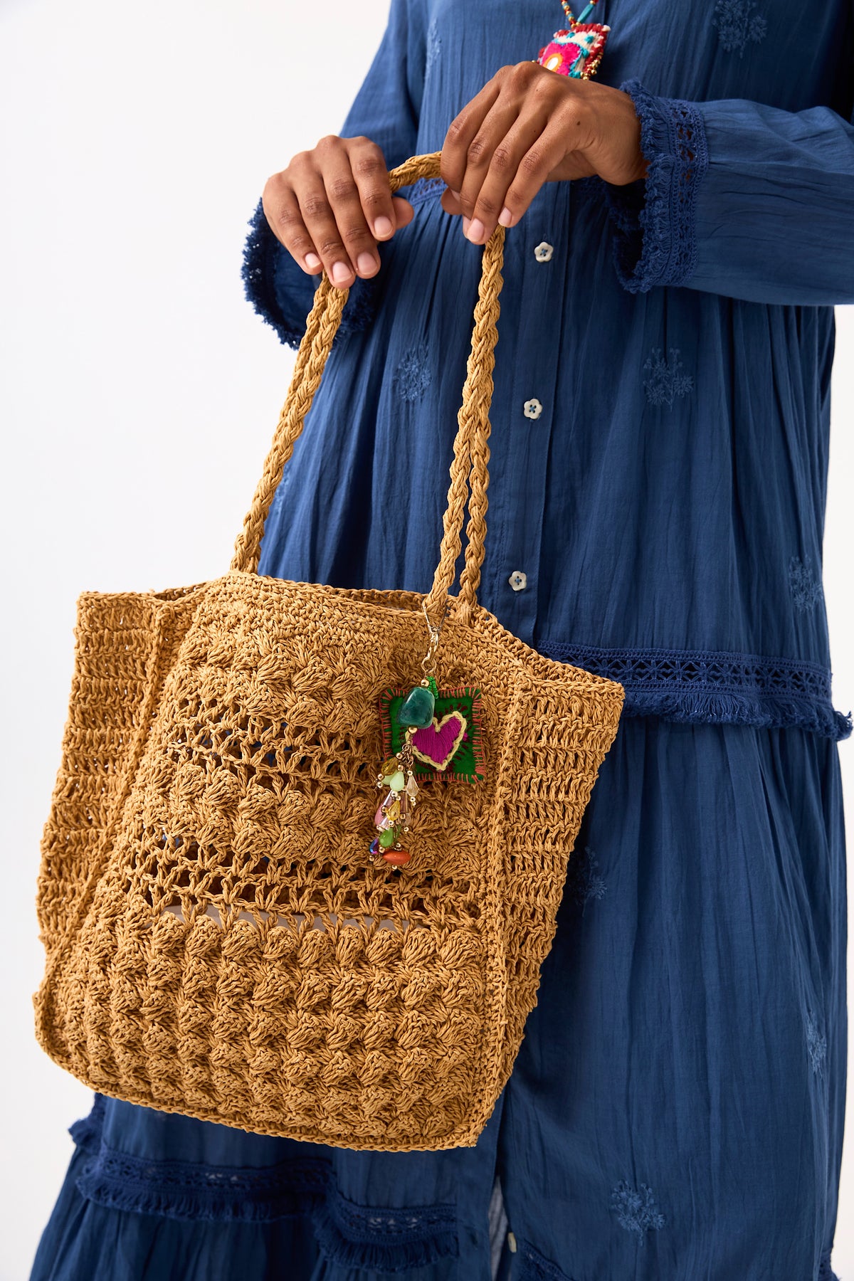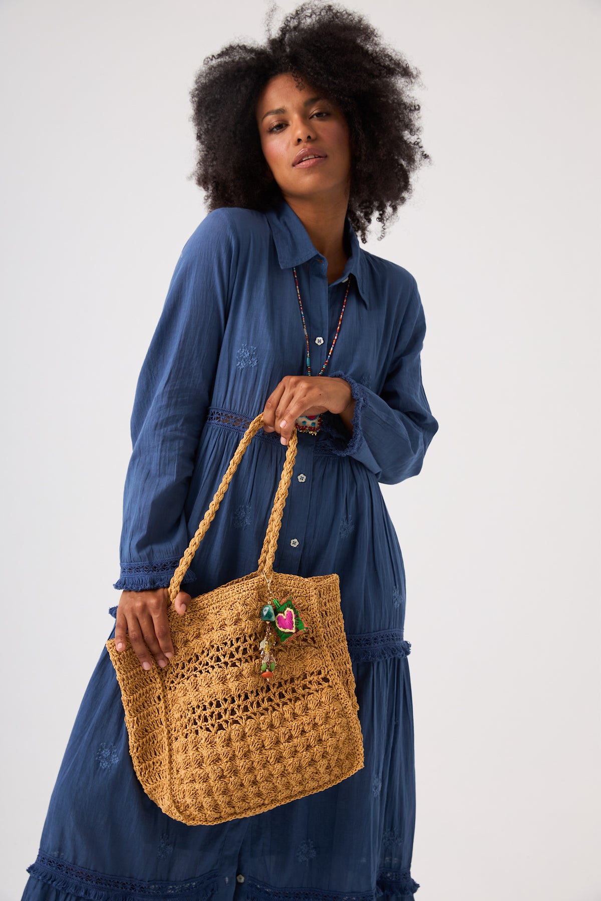 Ce sac en raphia confectionné à la main est l'accessoire estival indispensable. Il se distingue par ses grandes anses tressées, idéales pour un porté épaule confortable tout au long de la journée. Son design naturel est sublimé par un pompon bijoux amovible, apportant une touche de fantaisie artisanale et personnalisée à votre allure.