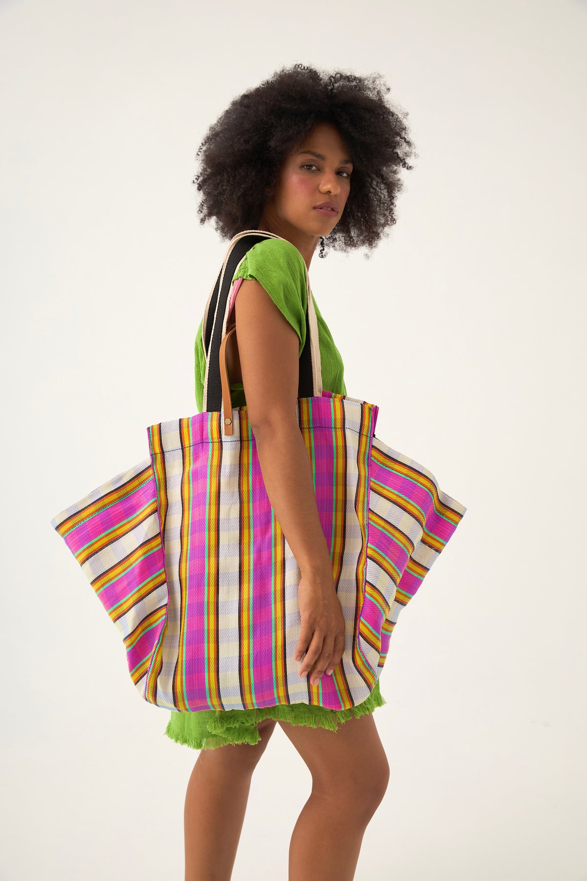 Ce très grand sac mise sur un volume oversize et une conception responsable en plastique recyclé. Ultra-pratique, il est doté d'un double système de portage avec des poignées en cuir pour un porté main et des anses en coton pour un porté épaule confortable. Son design fonctionnel est sécurisé par des fermetures à magnets, ce qui en fait l'allié idéal pour transporter tous vos essentiels avec style et légèreté.